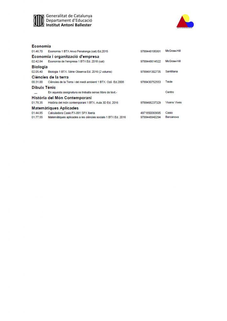 - 1r de Batxillerat – Llistat de llibres – Curs 2019/2020