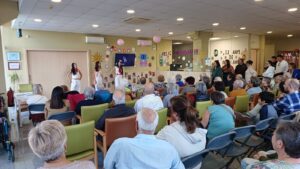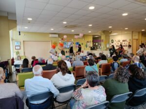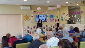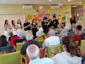 Vam crear un ambient festiu i de celebració, on alumnes i avis van gaudir i van cantar “Mamma Mia” d’ABBA, “Te estoy amando locamente” de Las Grecas, “Hay que venir al sur” de Raffaella Carrà, “Me gustas mucho” de Rocío Dúrcal o “Morir así es morir de amor” de Camilo Sesto, entre molts altres temazos del moment.
