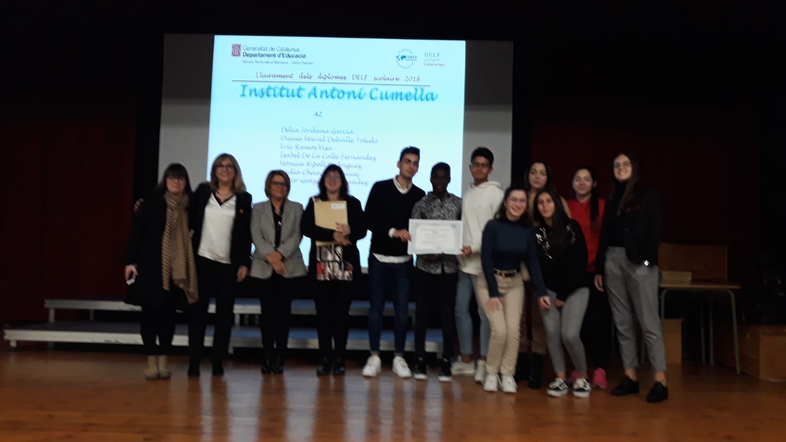 El passat 12 de febrer els nostres alumnes de 1r de batxillerat van recollir el diploma DELF (Diplôme d’Études en Langue Française) a la sala d’actes de l’Institut Alexandre Satorras de Mataró. Atorgats pel Ministeri d’Educació de França, els DELF tenen un gran reconeixement internacional. L’acte va comptar amb l’assistència de l’alumnat, professorat i famílies. Els diplomes van ser entregats personalment a cadascun dels alumnes pels diferents responsables del servei territorial del Maresme Vallès Oriental i l’Aliança Francesa de Granollers. Enhorabona a tots i totes pels resultats!
