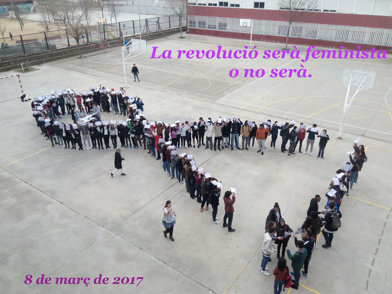 Per aquest motiu un grup de noies de 4t d´ESO va llegir un Manifest que pretenia denunciar l´estat de coses que encara no permeten que la dona i l´home hagin assolit l´estat d´igualtat real, mentre la resta d´alumnes van col.laborar a fer visible aquesta problemàtica fent un gran llaç color lila.