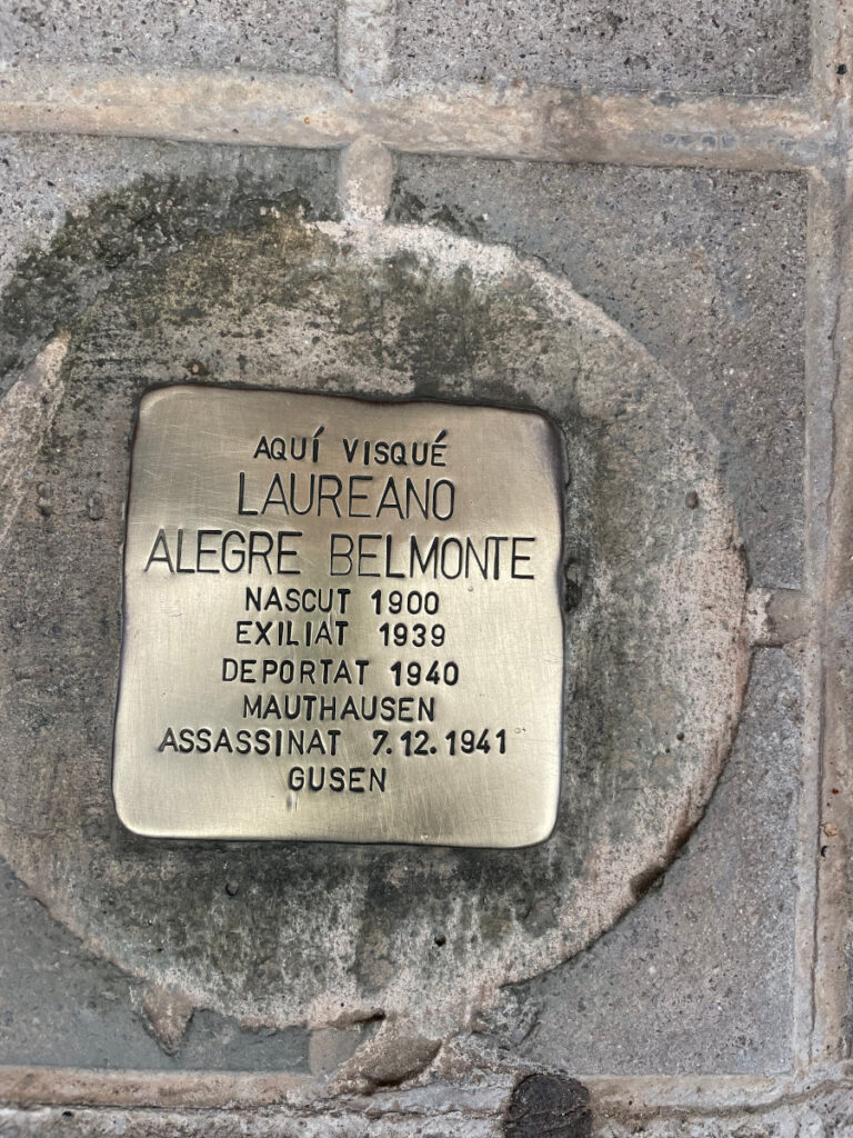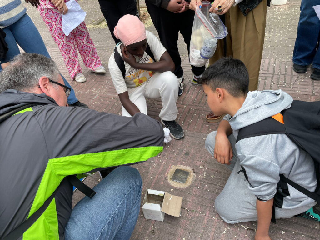 A cada Stolpersteine, vam llegir la biografia de la vida dels deportats als camps nazis i vam poder veure algunes fotos i documents de memòria de les víctimes. Cada grup s’havia preparat la seva lectura i en acabar vam netejar les llambordes, en senyal de respecte i memòria. Entre nosaltres també hi havia un familiar d’Eduard Garrigós Soler, que fou deportat al camp de Mauthausen. Ens va explicar que l’Eduard era el tiet del seu avi.