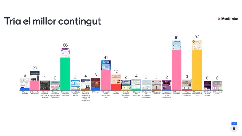 El premi al millor disseny és pel pòster de “la Memòria i l’alzheimer”, fet per la Israa Ben M Barka i la Victòria Saavedra i el premi al millor contingut és per al pòster de “la química a la cuina”, fet per al Joan Funes i la Lucía García.