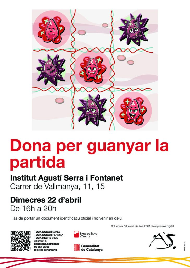 El pròxim dimecres 22 d’abril, de 16 h a 20 h, el nostre institut acollirà una nova campanya de donació de sang, organitzada en col·laboració amb el Banc de Sang i Teixits. Sota l’eslògan “Dona per guanyar la partida”, animem tota la comunitat educativa a participar en una iniciativa solidària que pot ajudar a salvar vides.