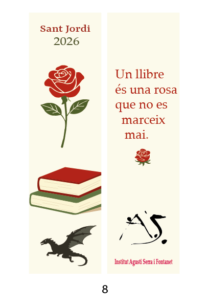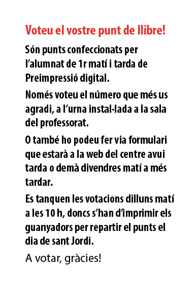Escollirem el punt guanyador de cada categoria i seran impresos per donar-los el dia de Sant Jordi a tot el professorat i personal PAS i els que sobrin quedaran per ser repartits a la biblioteca i a consergeria.