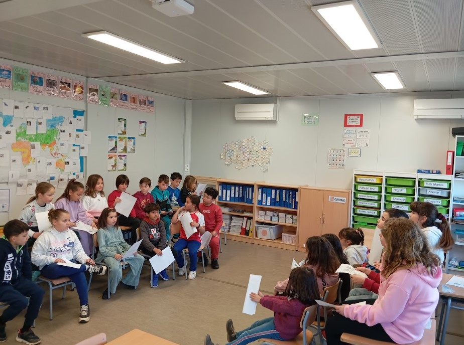 Per posar en pràctica els coneixements d’aquesta primera etapa, divendres passat vam representar “Una tarda al Paleolític”. Vam crear elements del paisatge com arbres i rius, a part de la cova, i ens vam convertir en un clan de cavernícoles construint-nos la roba amb teles, fent foc i eines, caçant, pescant, recol·lectant, menjant, pintant i comunicant-nos sense utilitzar la llengua.
