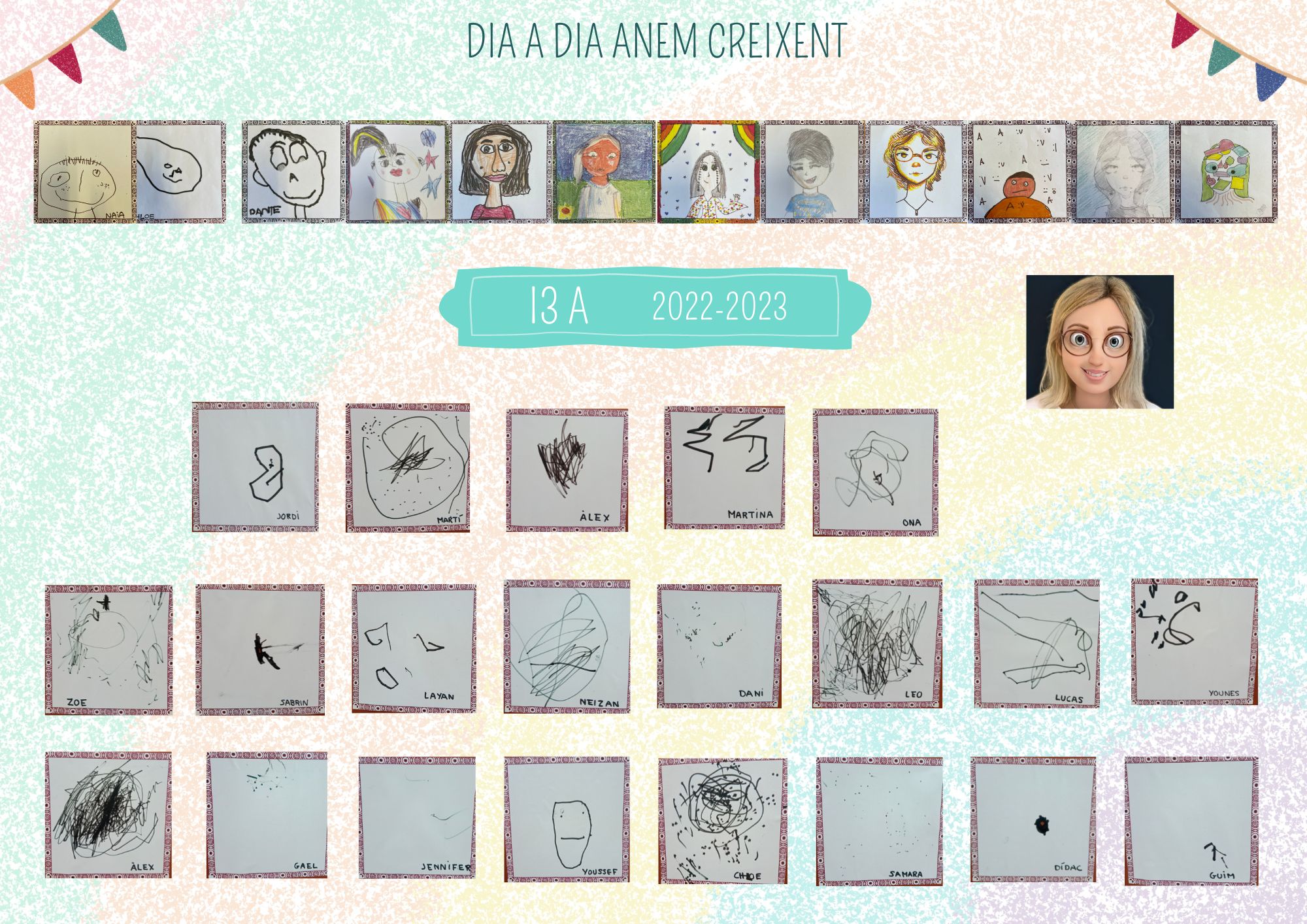 Aquest curs comencem amb moltes ganes com sempre i és per això que hem preparat aquestes orles tant originals. Veureu que son els autroretrats dels vostres fills i filles, i com diu el lema “Dia a dia anem creixent”!