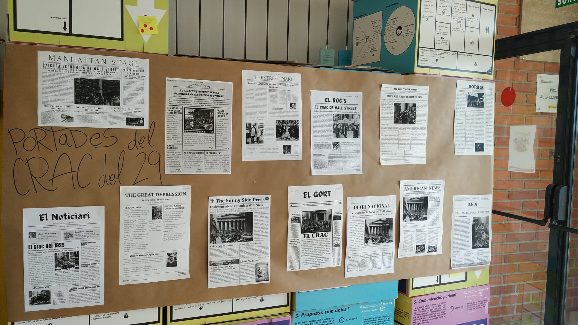 L’alumnat de quart d’ESO ha realitzat una portada de periòdic sobre el crac de la borsa nord-americana de l’any 1929, un esdeveniment que va influir profundament en la història política d’Europa. El treball consistia en transformar l’explicació del fet en un text de caràcter més divulgatiu, contextualitzat amb altres notícies, imatges i anuncis ajustats al període. D’aquesta manera han reformulat allò après i han reflectit els continguts d’una manera diferent.