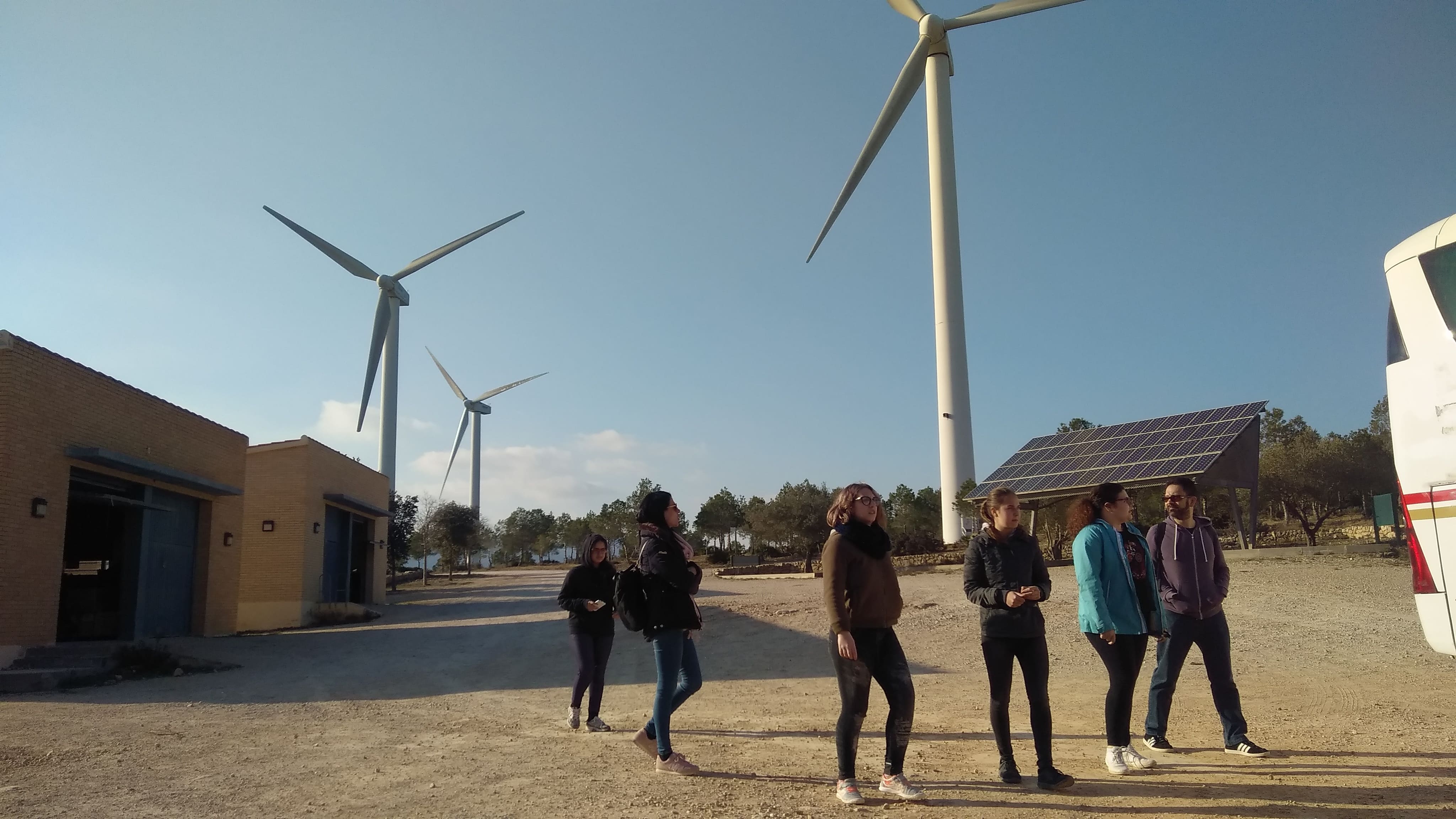 Un cop acabada la visita, van marxar al Perelló on van dinar i, en acabar de dinar, es van adreçar al parc eòlic Les Colladetes. Allí van rebre una xarrada informativa i actualitzada sobre energies renovables (especialment eòlica) on la responsable del parc va atendre una gran quantitat de preguntes dels nostres alumnes sobre la tecnologia eòlica així com sobre la política energètica. Tot seguit, van visitar una pala d’aerogenerador que hi havia en reparació a terra per observar de primera mà el material (composite) amb què estan fetes i finalment van visitar l’aerogenerador més gran del parc (l’ECO-100, de 3 MW de potència).