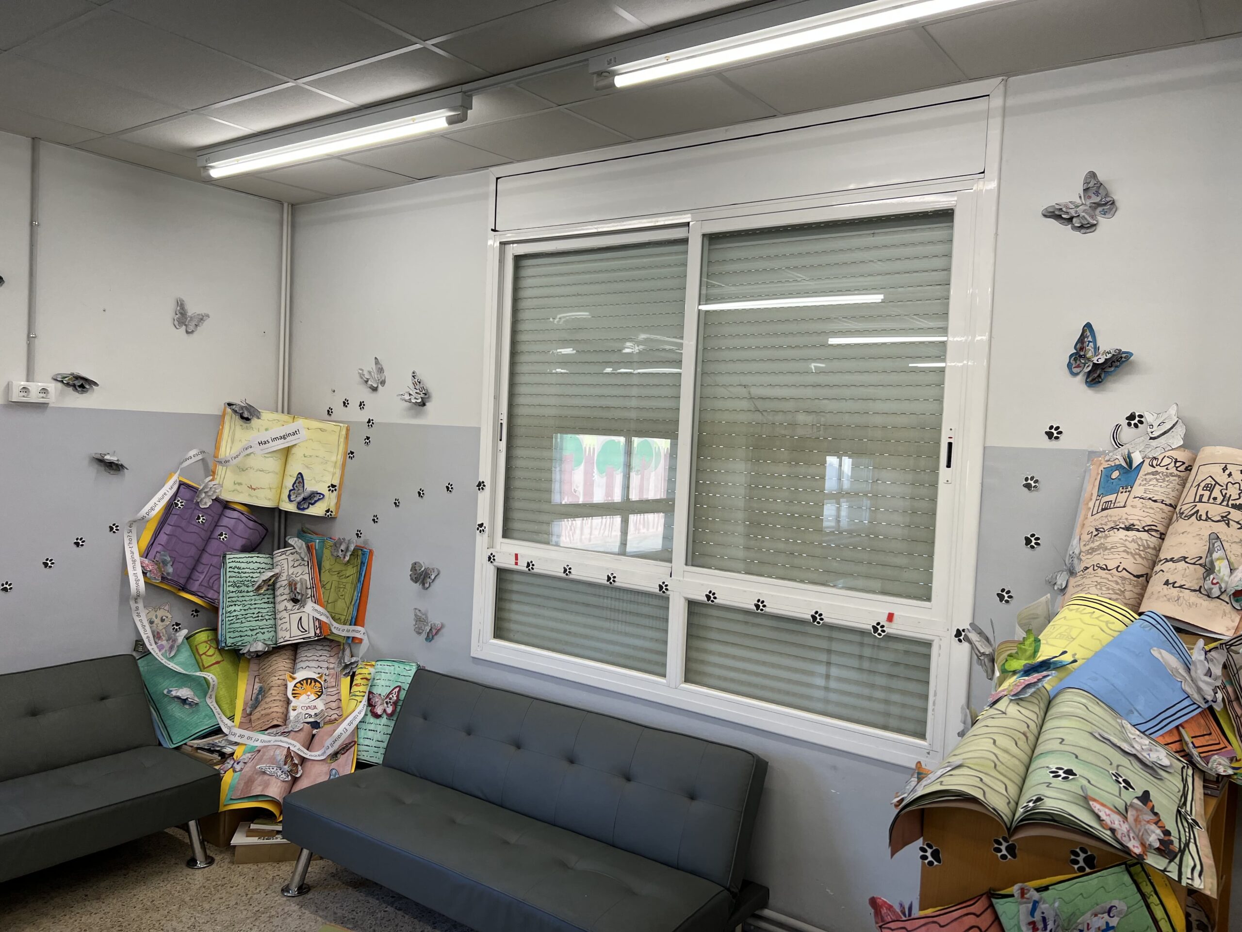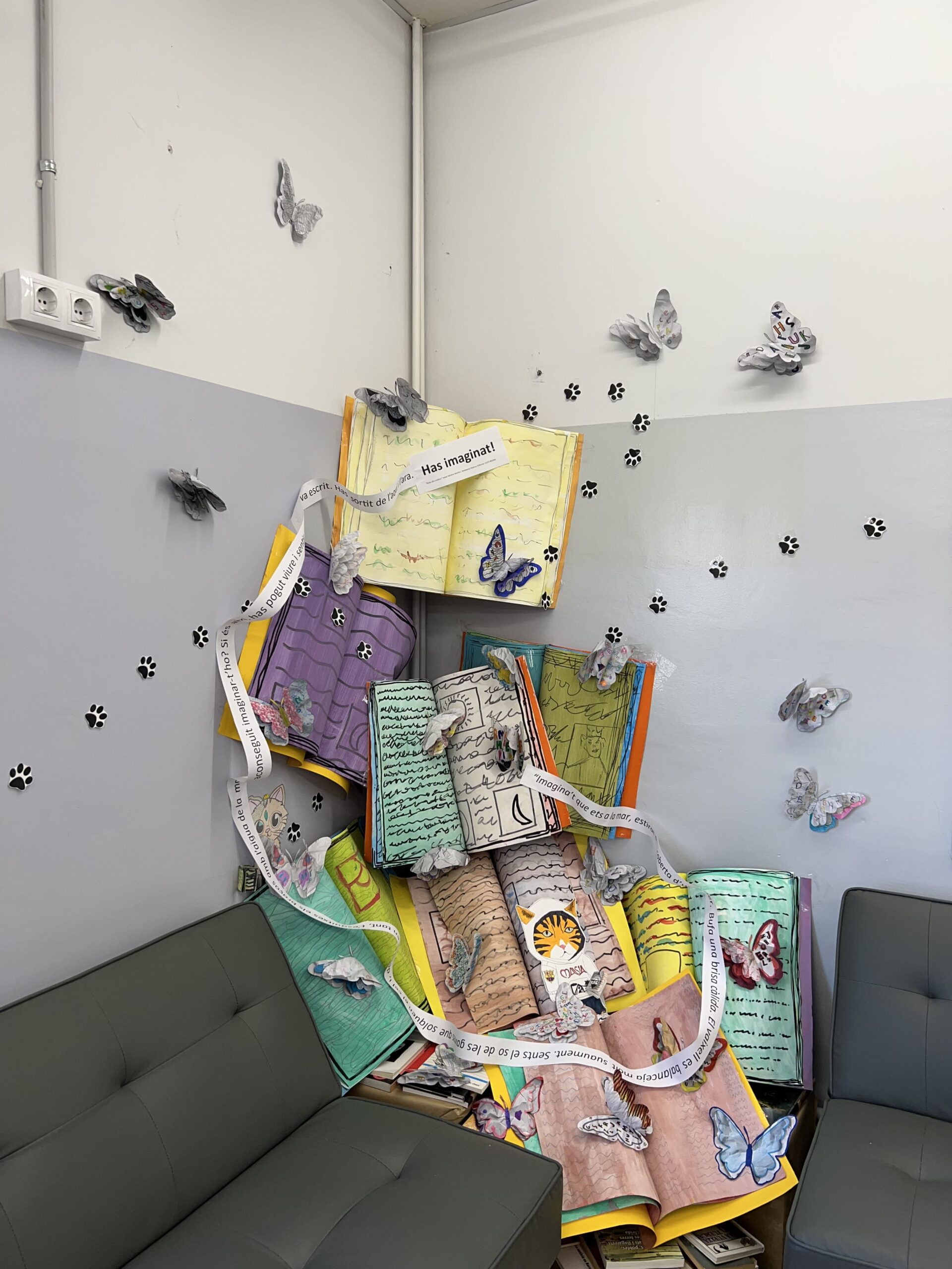 - 📖 A l’interior de la biblioteca: Dos grans muntatges amb llibres gegants oberts que deixen sortir el seu contingut, coberts de papallones que s’enlairen i escampen per tota la biblioteca.