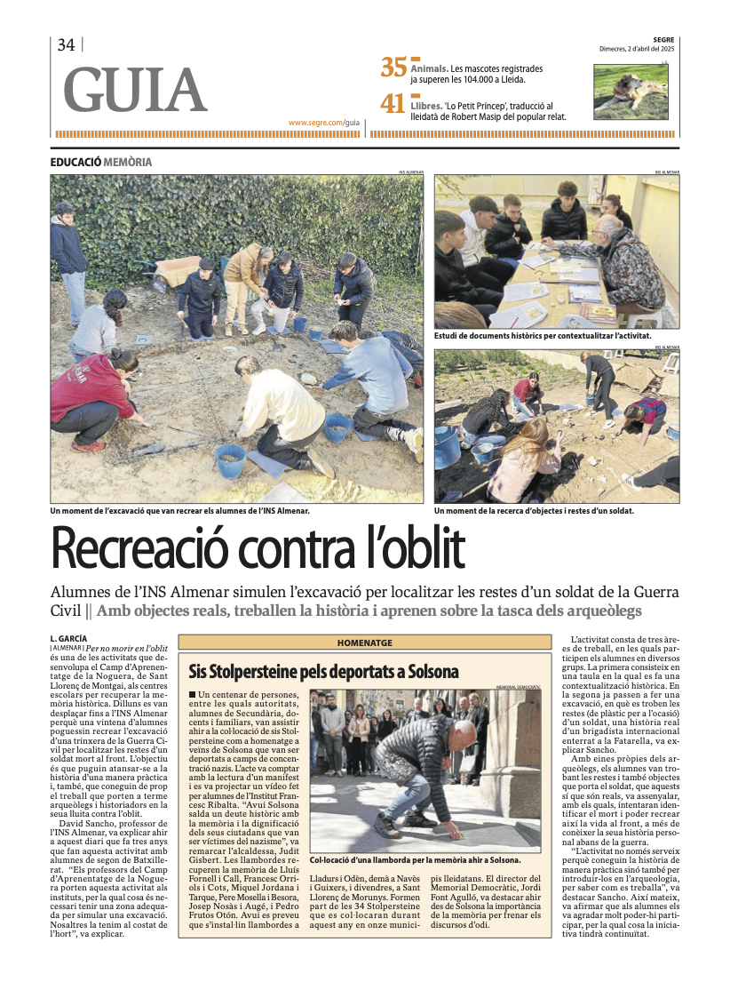 El diari Segre destaca l’activitat ‘Per a no morir en l’oblit’ dels alumnes de 2n de batxillerat