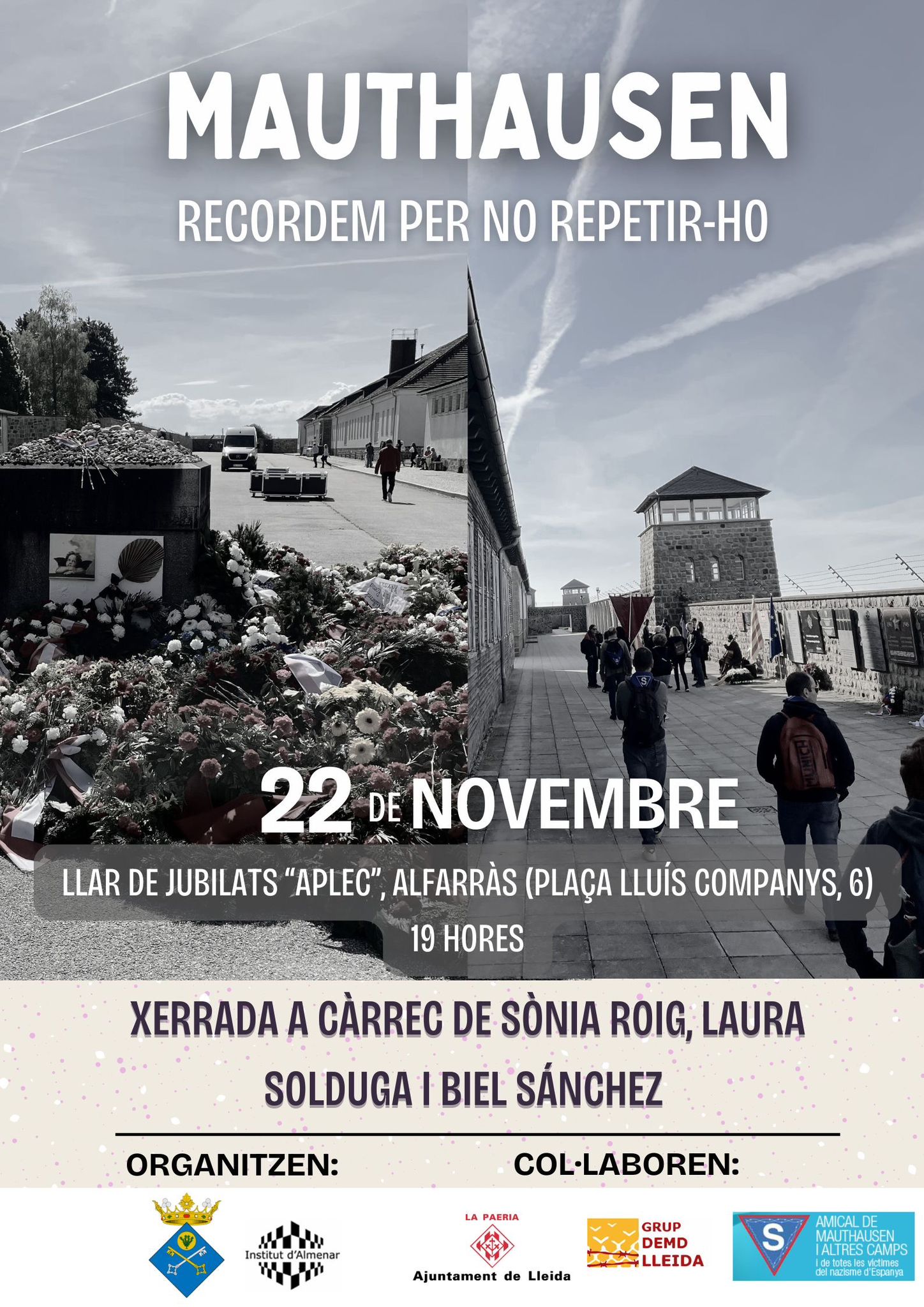 Aquest divendres a Alfarràs, els nostres alumnes Sònia Roig, Laura Solduga i Biel Sánchez ens explicaran el seu viatge al camp de concentració de Mauthausen (Àustria), on van participar als actes internacionals de commemoració del seu alliberament durant la Segona Guerra Mundial.