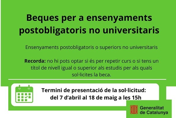 Avui 7 d’abril s’han obert els períodes de sol·licitud per les beques generals per estudis post obligatoris no universitaris. Les sol·licituds es poden fer fins el 18 de maig. Enguany des de l’Oficina Jove del Berguedà hem reforçat la informació sobre les beques per tal d’ajudar en el procés de sol·licitud. Des de l’espai de […]