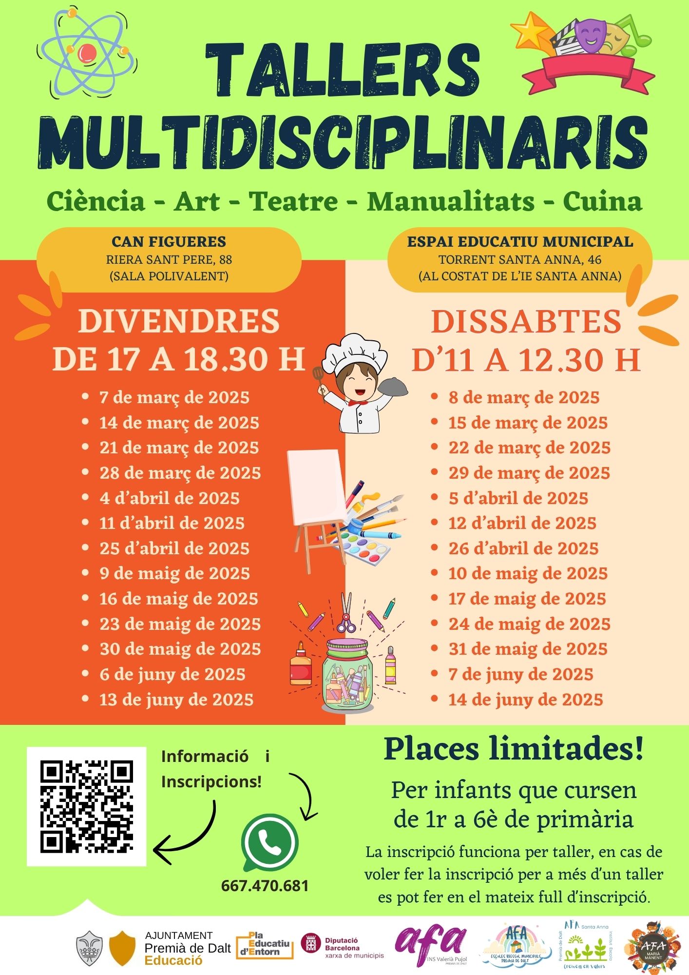 L’Ajuntament de Premià de Dalt, en el marc del Pla Educatiu d’Entorn (PEE), ha organitzat una nova activitat adreçada a l’alumnat de 1r a 6è de primària: TALLERS MULTIDISCIPLINARIS