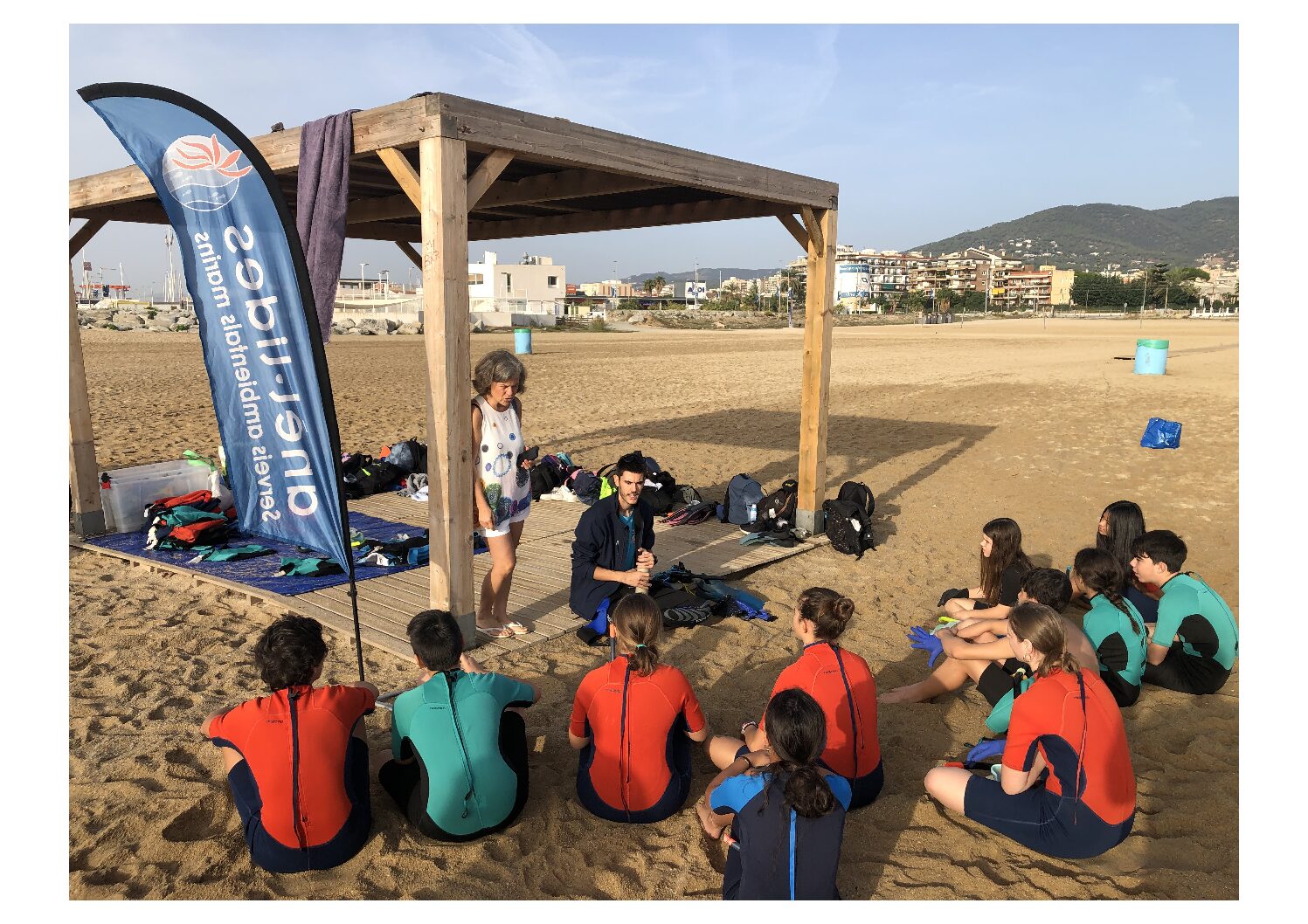The students put on wetsuits and went into the water to collect waste, which we later analyzed to figure out how it had ended up on the beach. Afterwards, both students and instructors weighed and classified the different types of litter collected. To wrap up the session, we held a group reflection on what can be done to avoid polluting the sea and the environment.