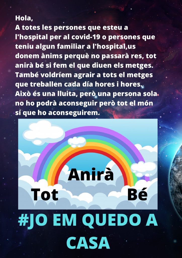 L’alumnat de la classe dels Paralímpics i els Avatars hem volgut escriure unes cartes amb missatges d’ànim pels infectats del Coronavirus que no poden estar amb les seves famílies, pels avis, que no poden abraçar als seus néts, i per tota la gent que està vetllant perquè aquesta situació tan estranya passi com més aviat millor (metges, personal sanitari, policia, transportistes, comerciants….).