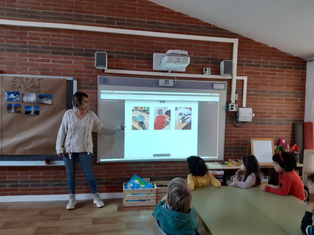 Avui hem fet un experiment per veure com l’aigua canvia d’estat. Hem pogut observar com canvia de líquid a gasós i altra vegada a líquid. Després de fer l’experiment hem aprofitat per mirar les fotografies del procés i ordenar la seqüència de l’experiment tots junts a la pantalla.