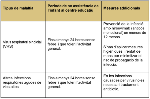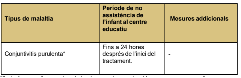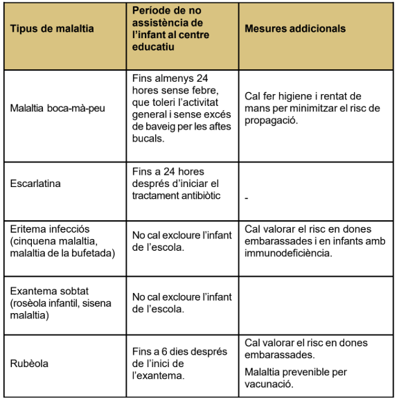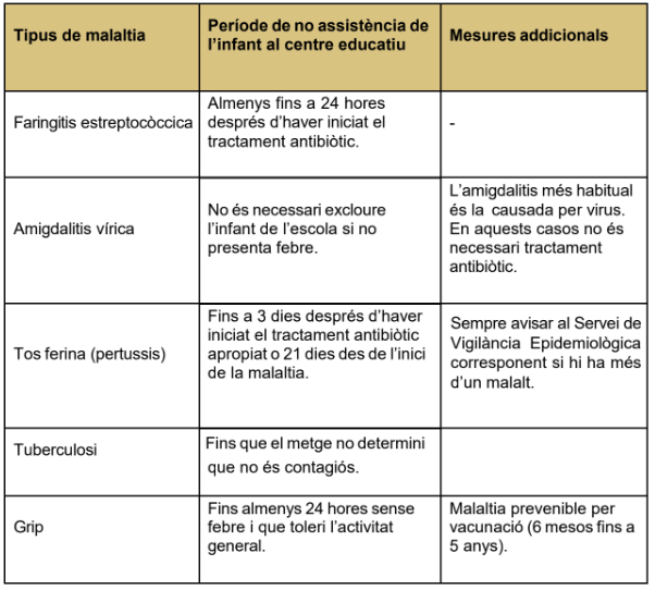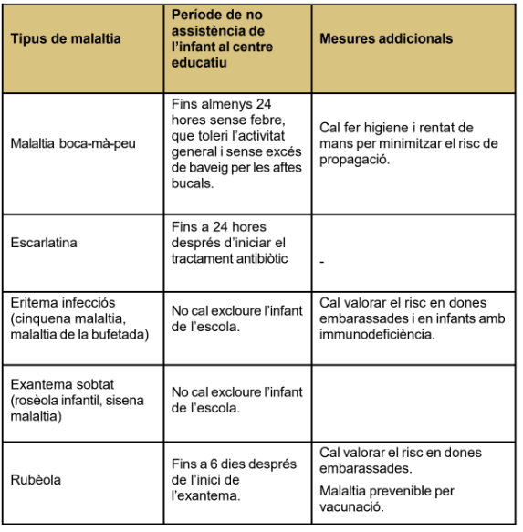 - Totes les malalties que cursen febre, a més de les recomanacions específiques per a cadascuna, cal que l’infant o jove, hagi estat 24 hores sense febre abans de tornar al centre
