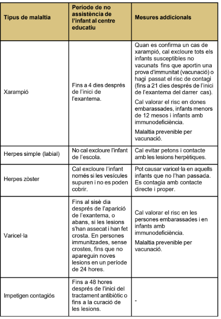 Dos dels criteris recollits en el document de Departament de Salut “Criteris de no assistència de l’alumnat a l’escola o llar d’infants durant un període de temps determinat a causa de malalties transmissibles” són els següents: