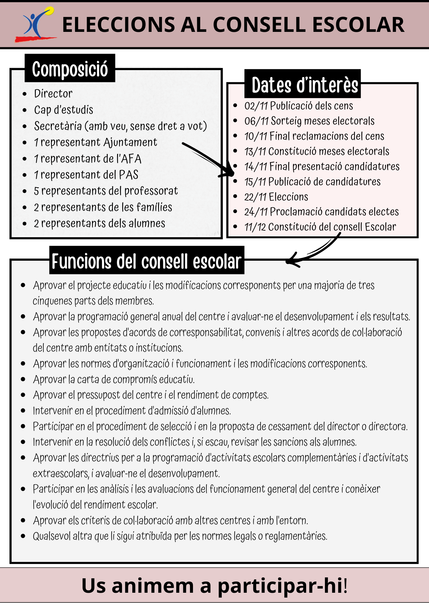 *Al ser un centre nou, cal constituir un nou consell escolar i, per tant, cal escollir tots els membres elegibles. Cada sector escull els seus representants. Com que les renovacions són cada dos anys, els membres amb més vots seran elegits per un període de 4 anys i els membres menys votats seran elegits per un període de dos anys on es renovaran.