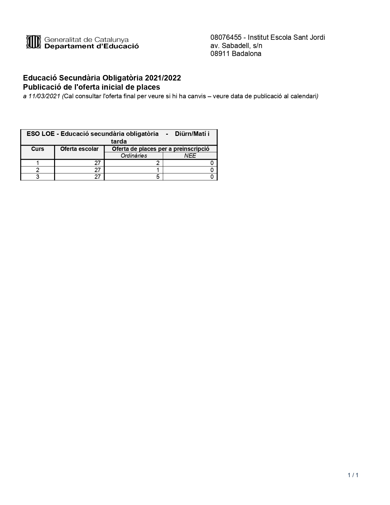 Oferta inicial de places curs 2021-2022