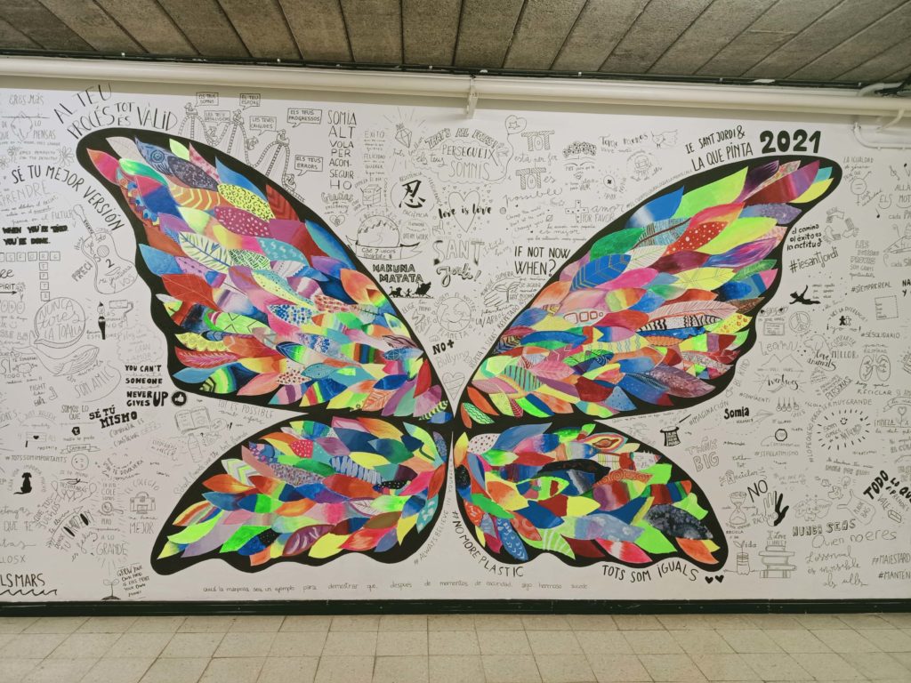 En el següent enllaç podeu gaudir del vídeo que ens ha fet arribar la Laura del seu pas pel Sant Jordi, i clicant sobre la imatge del mural de la papallona, tot un recull de fotografies de tot el procés en el que hi hem participat plegats.