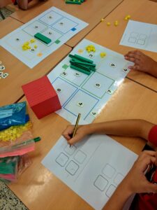 A matemàtiques posem en pràctica la resta portant-ne a partir de la descomposició en unitats, desenes i centenes, i les taules de multiplicar construint figures geomètriques.
