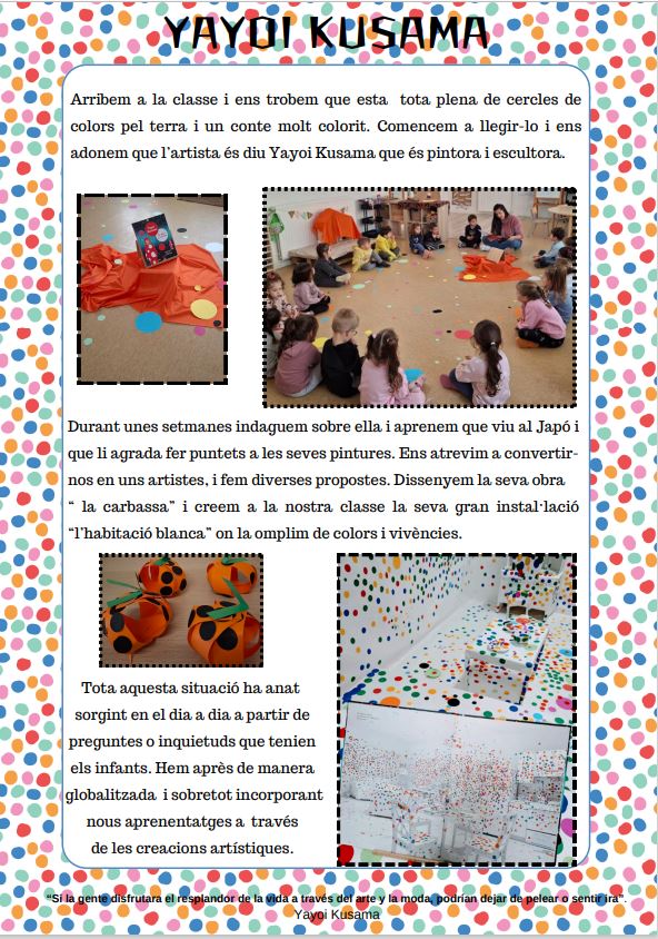 Un cop acabada la situació d’aprenentatge relacionada amb la Yayoi Kusama us comparteixo totes les fotos de tot el procés. Els nens i nenes d’I4 han treballat molt i han après molts aspectes relacionats amb aquesta pintora / escultora i l’art 🙂
