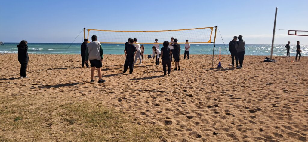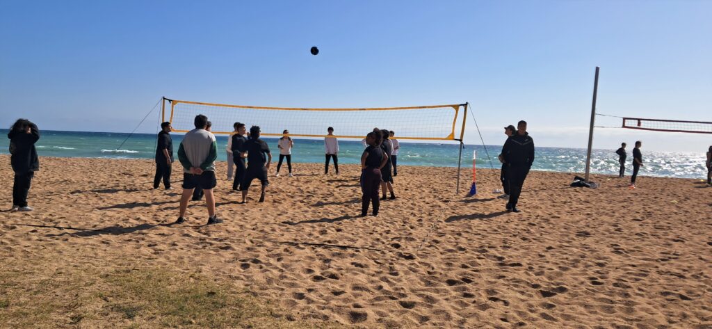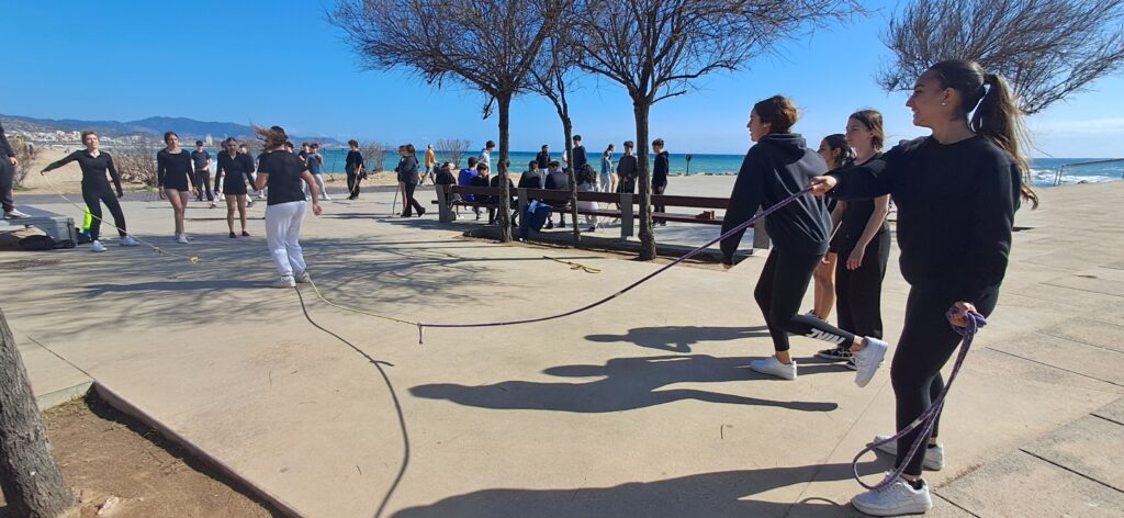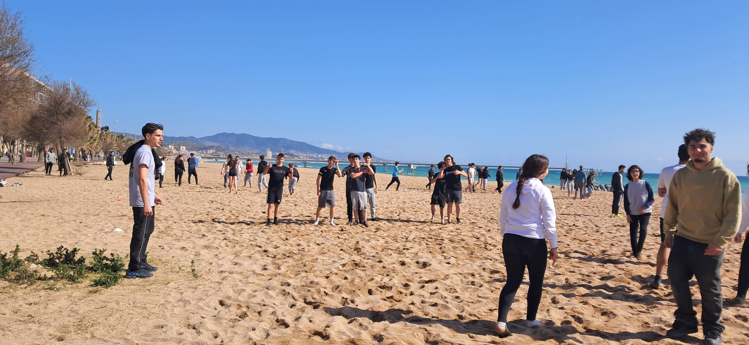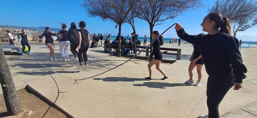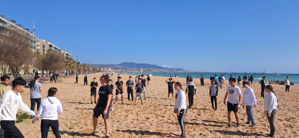 Vam anar a la platja del Coco (Badalona) i vam jugar a tres tipus de jocs: vòlei platja, ultimate frisbee i diversos reptes de saltar a la corda.