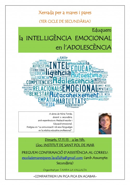 DIMECRES 1 DE FEBRER: TALLER PER A MARES I PARES “PROJECTE D’INCLUSIÓ DE L’EDUCACIÓ EMOCIONAL AL PROJECTE DE CENTRE”