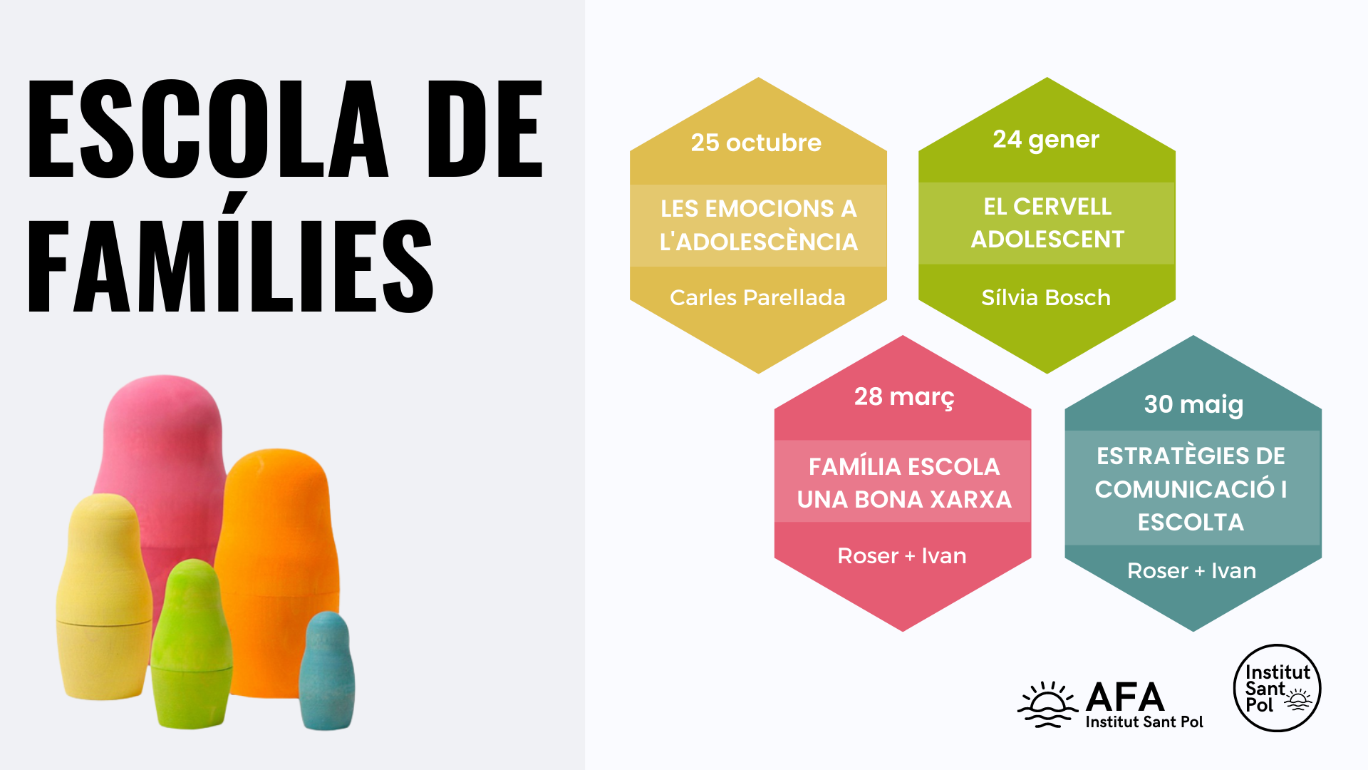 De la mà de l’AFA de l’institut s’han programat quatre tallers, xerrades, espais de trobada per a famílies dels nois i noies de l’institut amb la idea de formar-nos, compartir i aprendre uns dels altres.