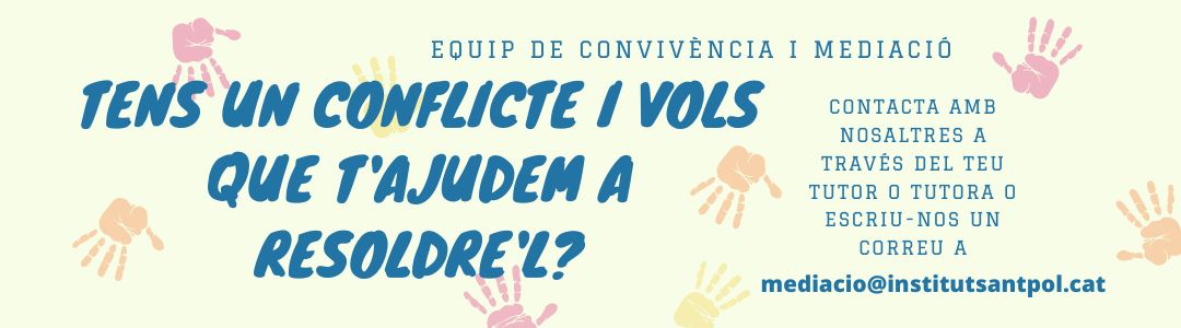 Des de fa unes setmanes, estem tornant a impulsar el servei de mediació, ara que els nois i noies de l’equip de convivència estan enllestint la seva formació. Les mediadores i mediadors ofereixen suport a l’alumnat per resoldre els seus conflictes.