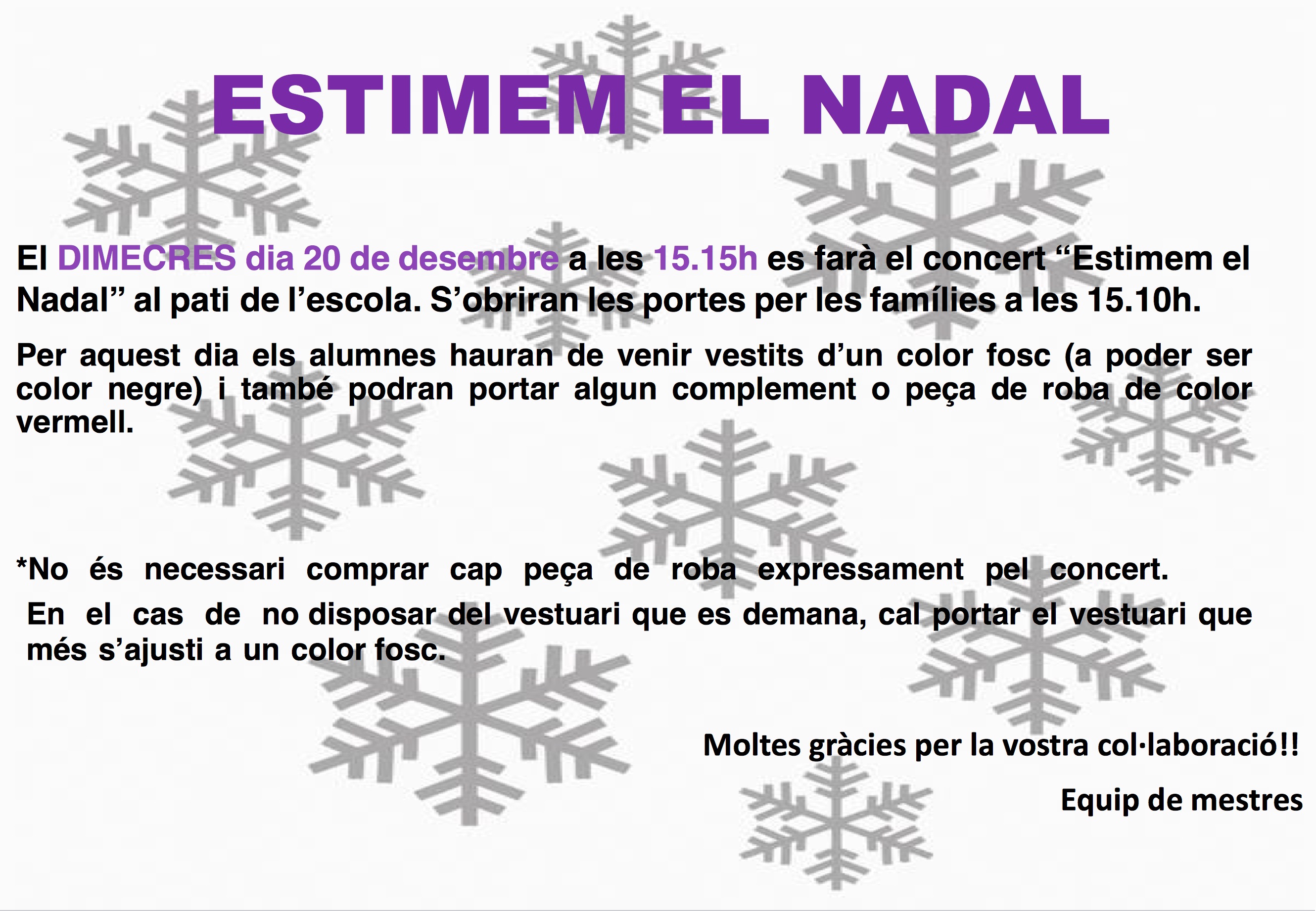 Dimecres, dia 20 de desembre, a les 15:15h tindrà lloc el concert “Estimem el Nadal” al pati de l’escola. Cliqueu la imatge per tenir més informació.