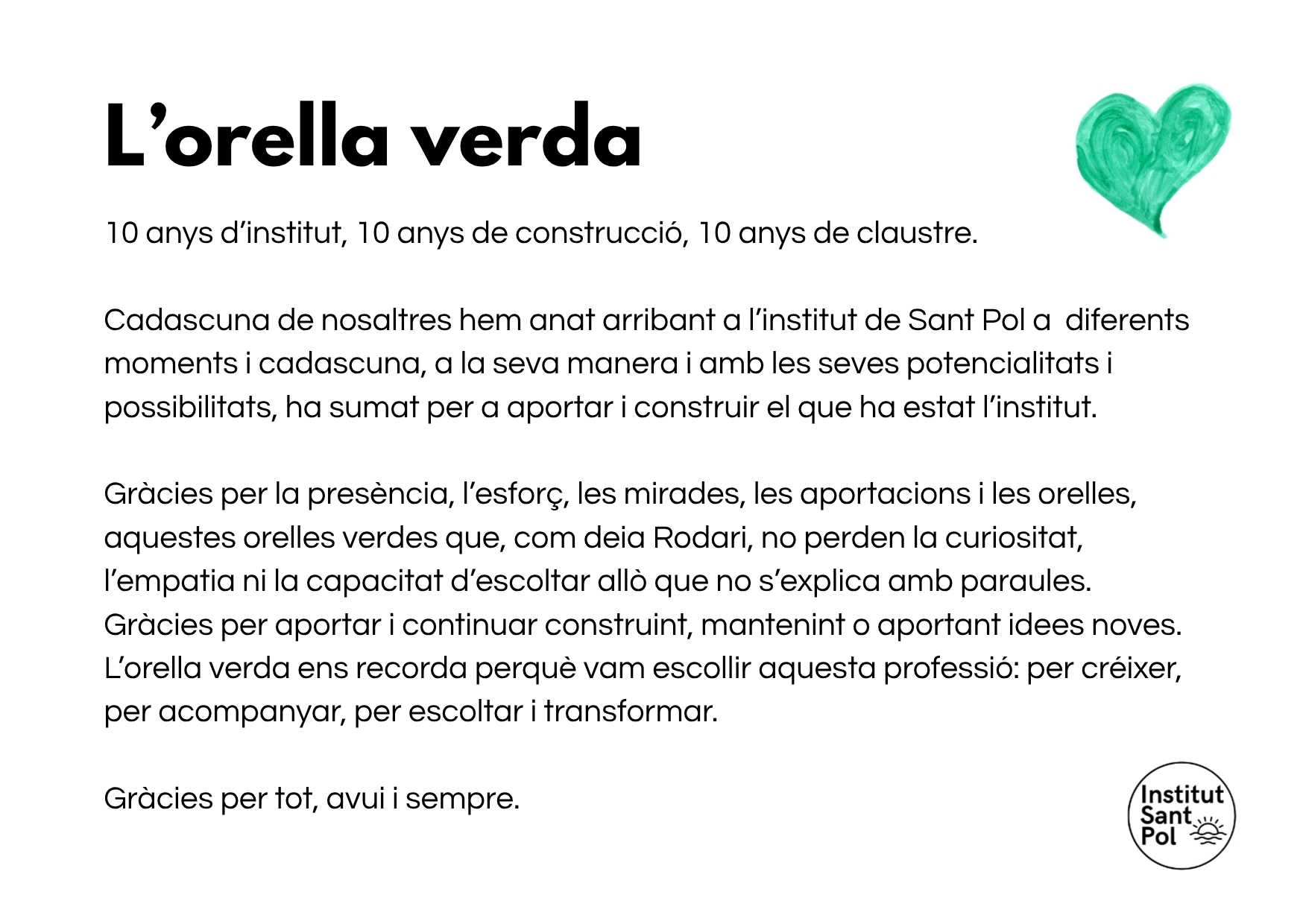 Avui és un dia de tants i també un dia dels importants; és el darrer dia de qui ha estat l’Institut Sant Pol, 10 anys de creació i d’invenció constant, 10 anys d’alta intensitat, de molt treball i de força canvis. El tancament ha estat gradual i sort, perquè ens ha permès fer-ho a poc a poc i sense pressa; ens hem acomiadat dels nois i noies, principals protagonistes, ens hem acomiadat de les famílies, hem celebrat amb un sopar els 10 anys i avui ens hem acomiadat els docents fent el darrer claustre.