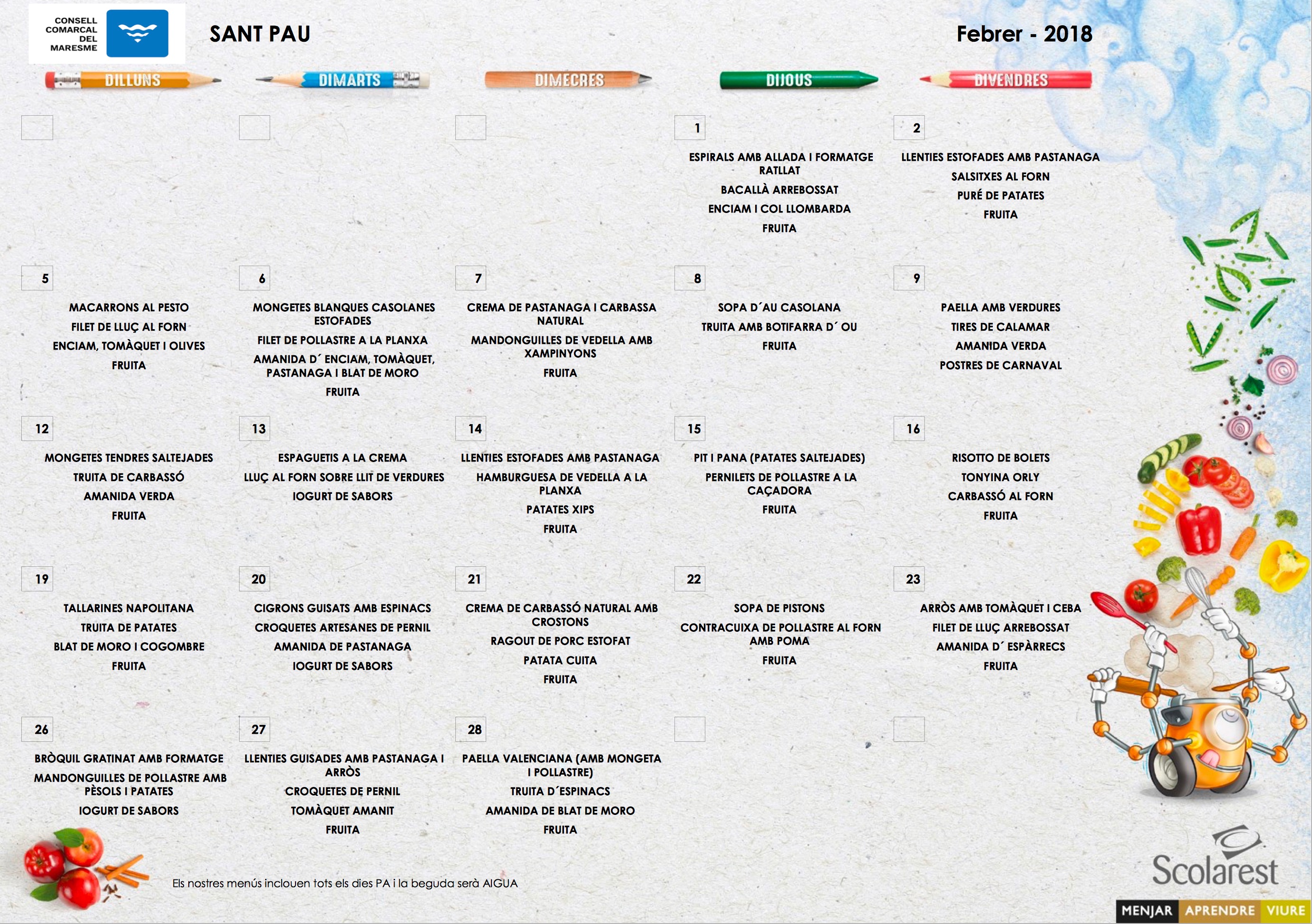 Menú FEBRER Feu un comentari / Per Escola Sant Pau / 30/01/2018 / General Portada Ja teniu a la vostra disposició, el menú del proper mes de febrer.