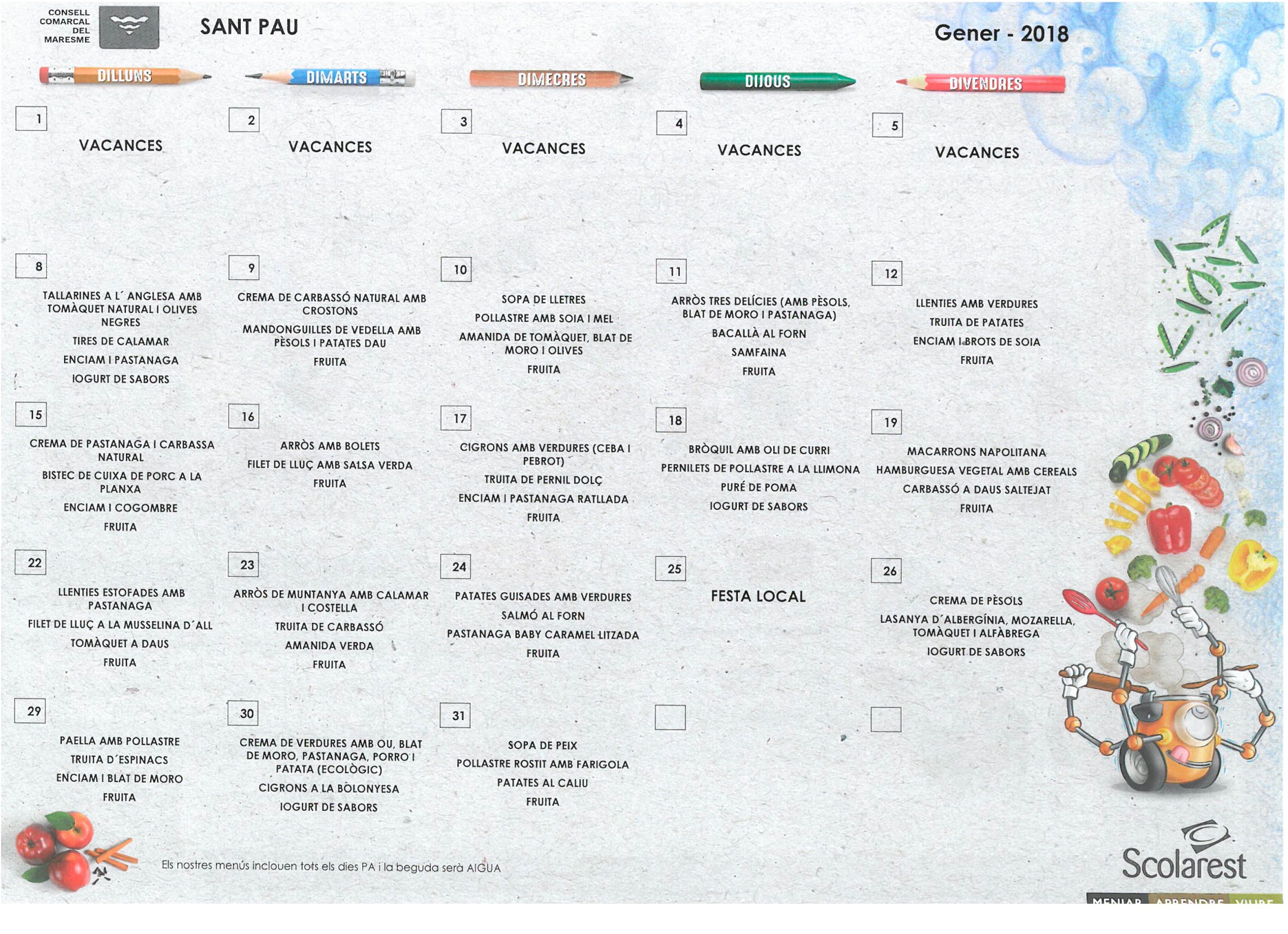 Aprofitem per publicar el menú del menjador d’aquest mes de gener.