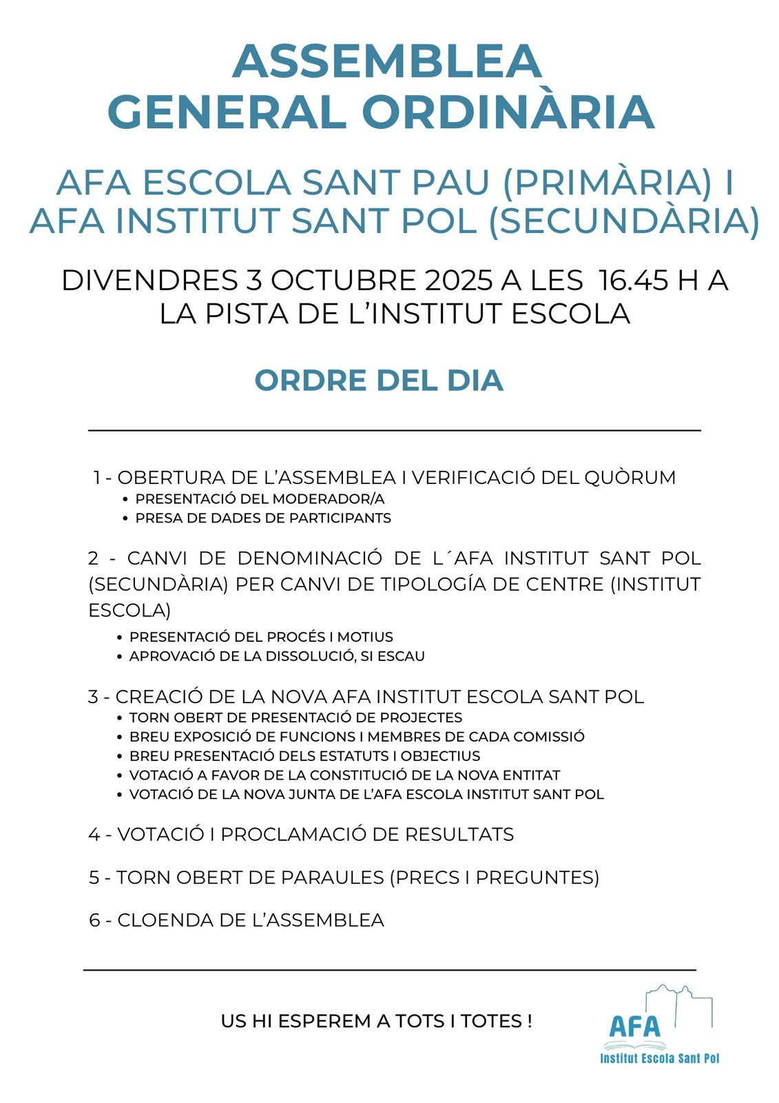 Aquesta assemblea és especialment important i històrica per a la nostra comunitat educativa, ja que hi presentarem el projecte de creació de la nova AFA Escola-Institut Sant Pol, que unirà en una sola entitat les actuals AFAs de Primària i Secundària.