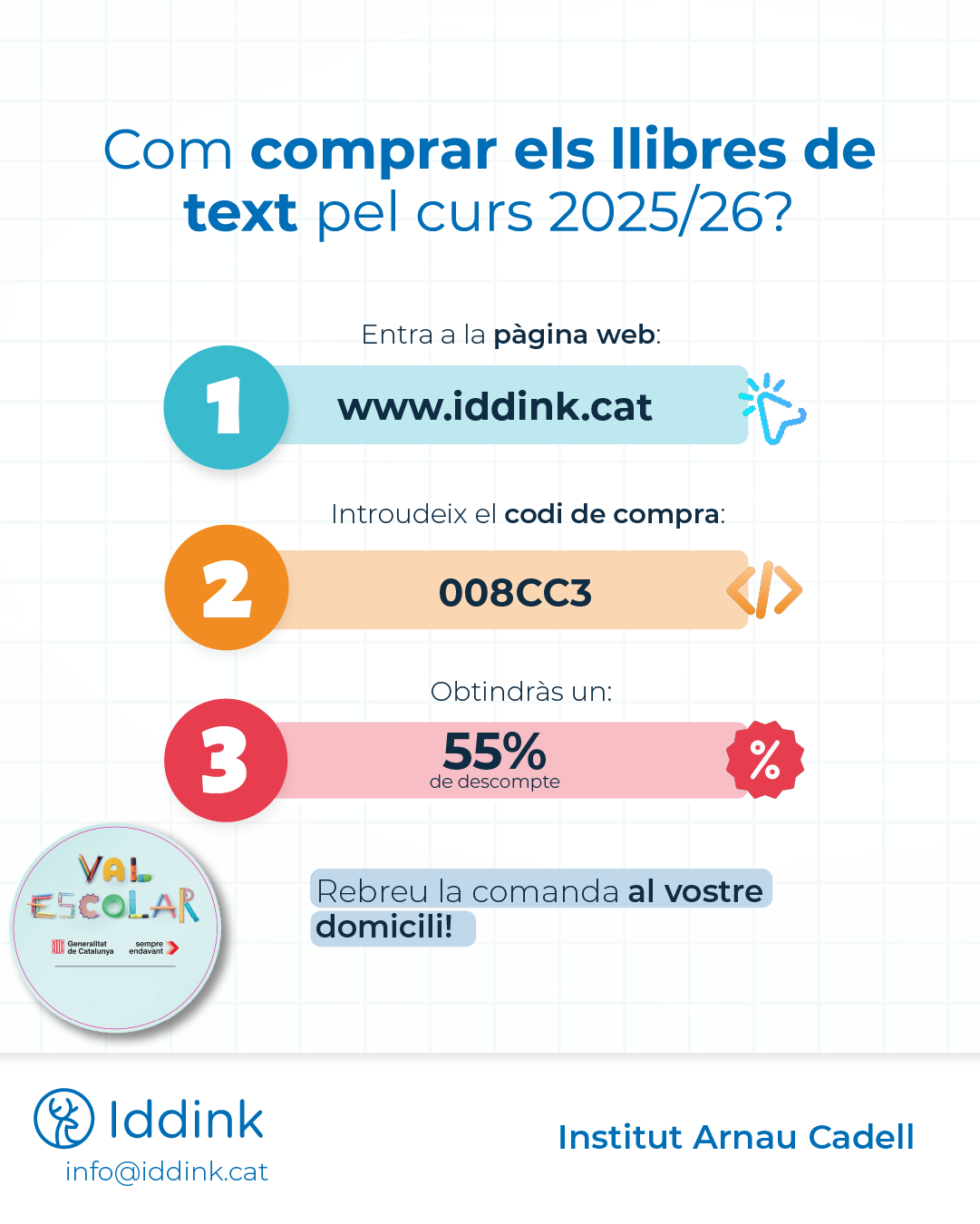 En cas que no pugueu fer la devolució presencialment el dia 25 de juny, caldrà contactar directament amb Iddink per gestionar l’enviament dels llibres per correu o missatgeria.