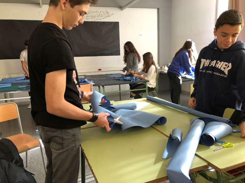 L’activitat plàstica es va fer en dues fases. La primera a l’aula de Dibuix de l’Institut Banús, retallant papers amb formes lliures. La segona al mateix mur, enganxant-hi els papers i creant les composicions que veieu a les imatges.