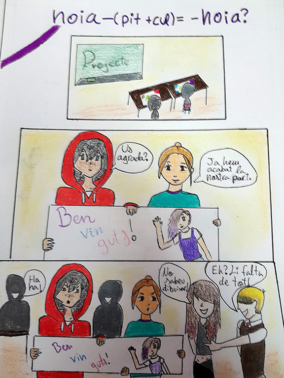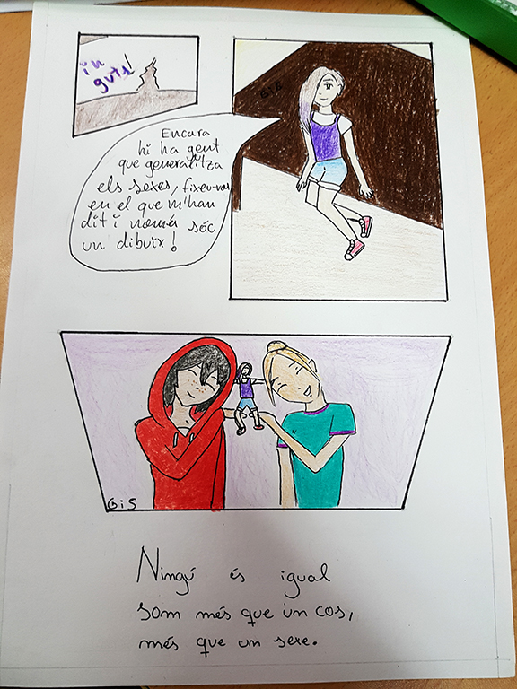 Amb aquests còmics, realitzats a la classe de Visual i Plàstica de 2n d’ESO, participem en el Premi Jove de Còmic de Sant Martí. Aquesta és la tercera convocatòria. El premi té com a finalitat sensibilitzar adolescents i joves sobre el fenomen de la violència masclista i implicar-los en la lluita per l’erradicació de les discriminacions de gènere i en la creació de nous imaginaris igualitaris i no sexistes, en el marc de la cultura de la pau i de la no violència.