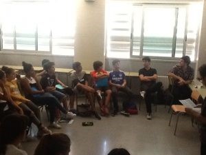 Catorze estudiants de 2on d’ESO els esperen plens d’il·lusions,curiositat i ganes d’aprendre. La Elii la Marina, alumnesde 1er de Batxillerat de Literatura Universal faran el seguiment de la sessió.