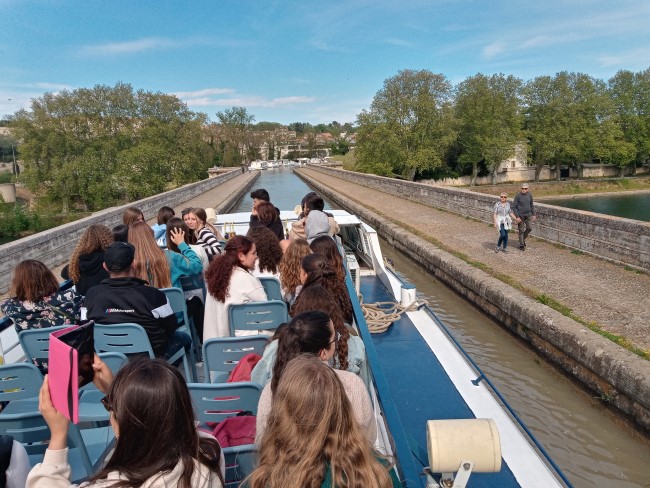 A Colombiers, vam dinar i embarcar-nos en una péniche, que va conduir-nos fins a Besiers a través del Canal du Midi, una obra d’enginyeria única que des de fa molts segles uneix la Mar Mediterrània amb l’Oceà Atlàntic travessant el sud de França. Prop de Besiers, vam creuar les nou rescloses de Fonseranes i l’espectacular pont-canal de l’Orb. A la tarda vam passejar-nos per la ciutat i els jardins del Plateau des Poètes.
