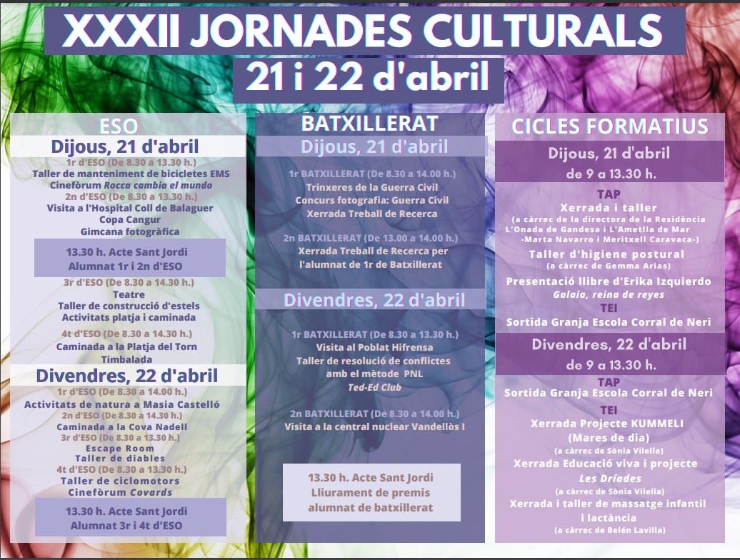 Una àmplia varietat de xerrades, tallers, sortides i activitats ompliran els dos dies de les Jornades Culturals, que aquest curs acompleixen la seva 32a. edició al nostre centre. Com cada any, les Jornades es programen per oferir a l’alumnat activitats de caràcter cultural i científic que habitualment no es poden tractar a les aules a causa de les condicions d’horari i d’espai que requereixen. Totes les activitats han estat proposades pels diversos departaments didàctics del centre i compten també amb la col·laboració de l’Ajuntament del municipi. En el cas de l’ESO i el Batxillerat, les Jornades es clouran amb l’acte de celebració de la diada de Sant Jordi.