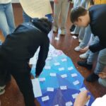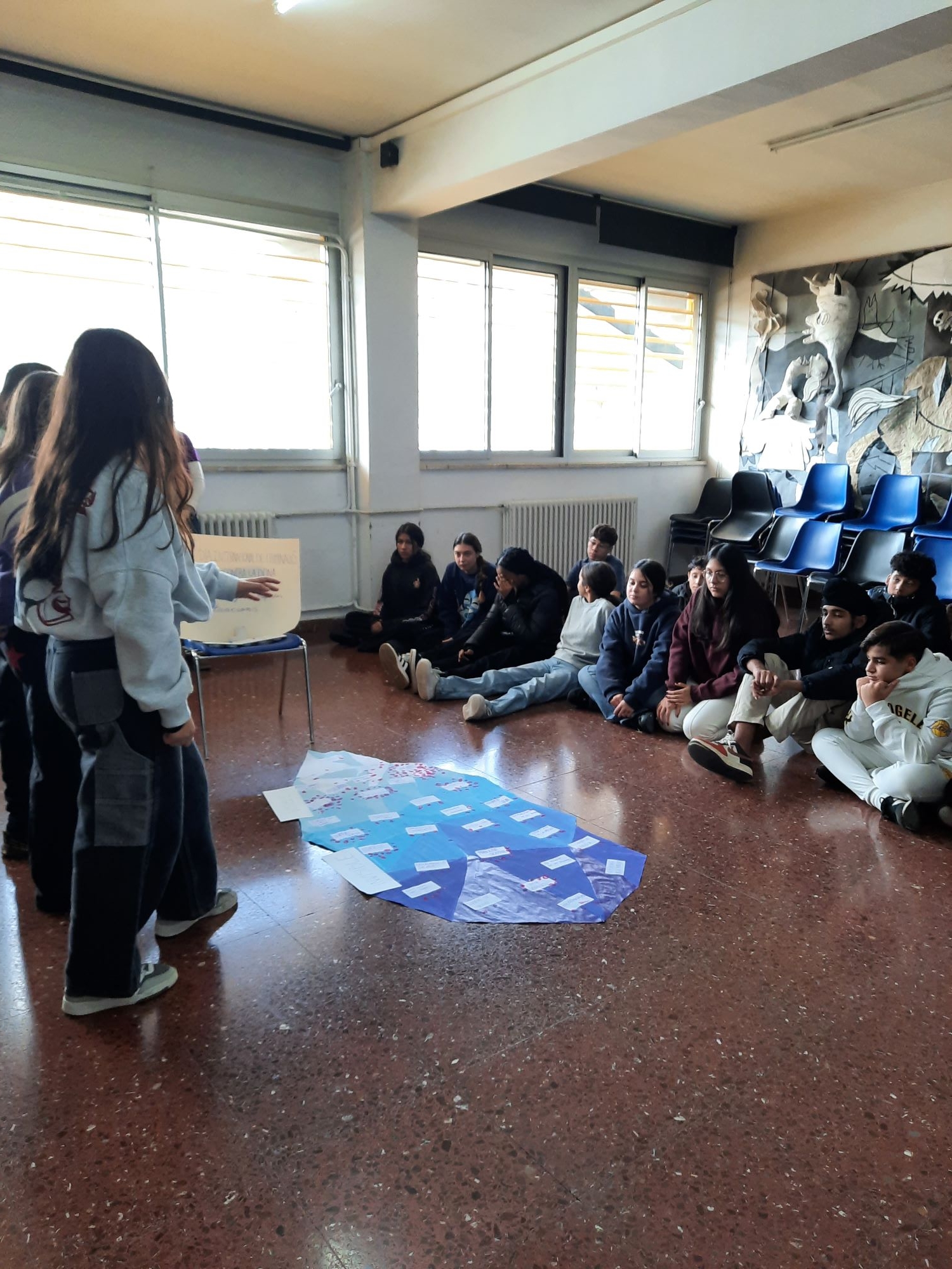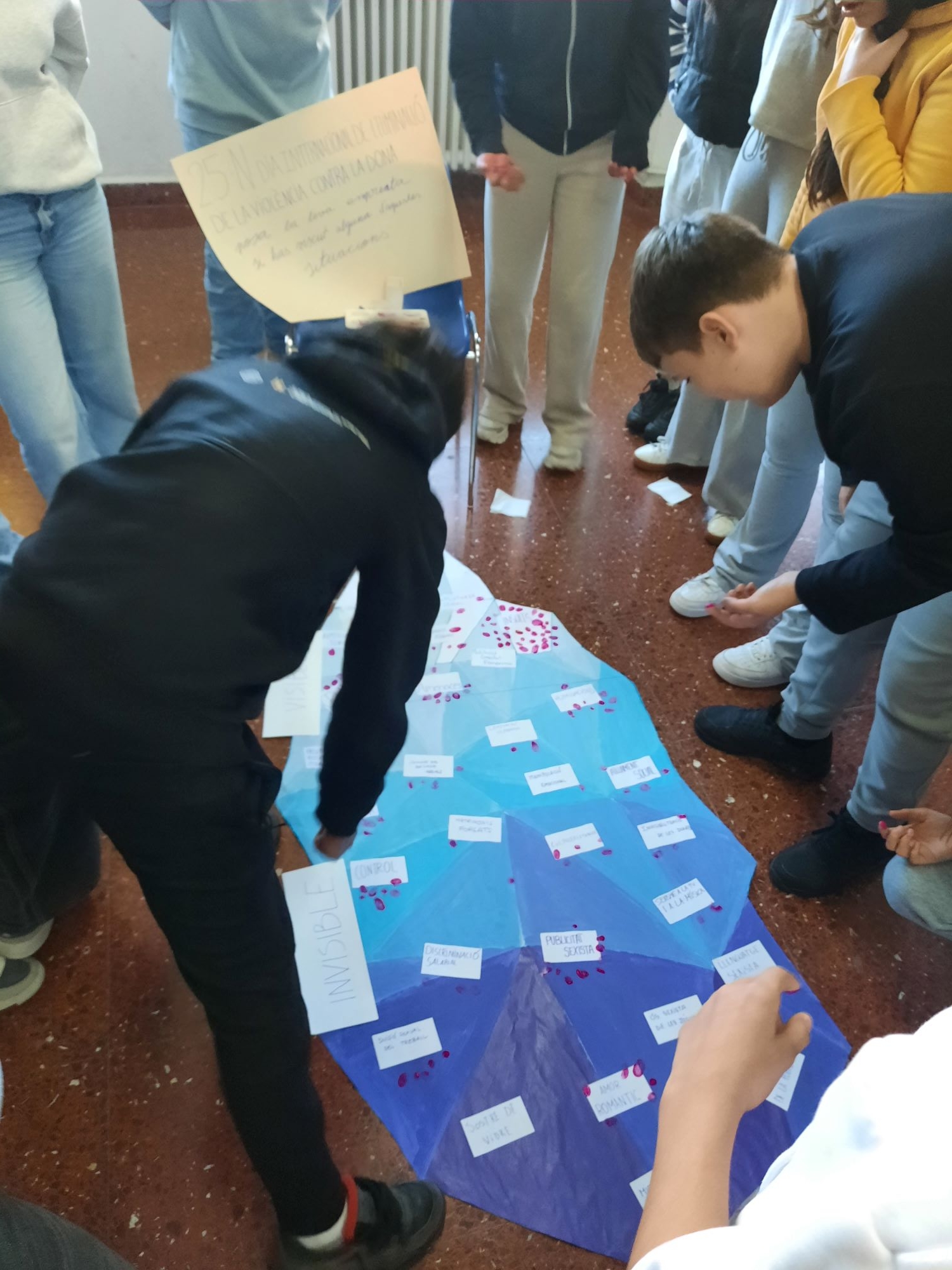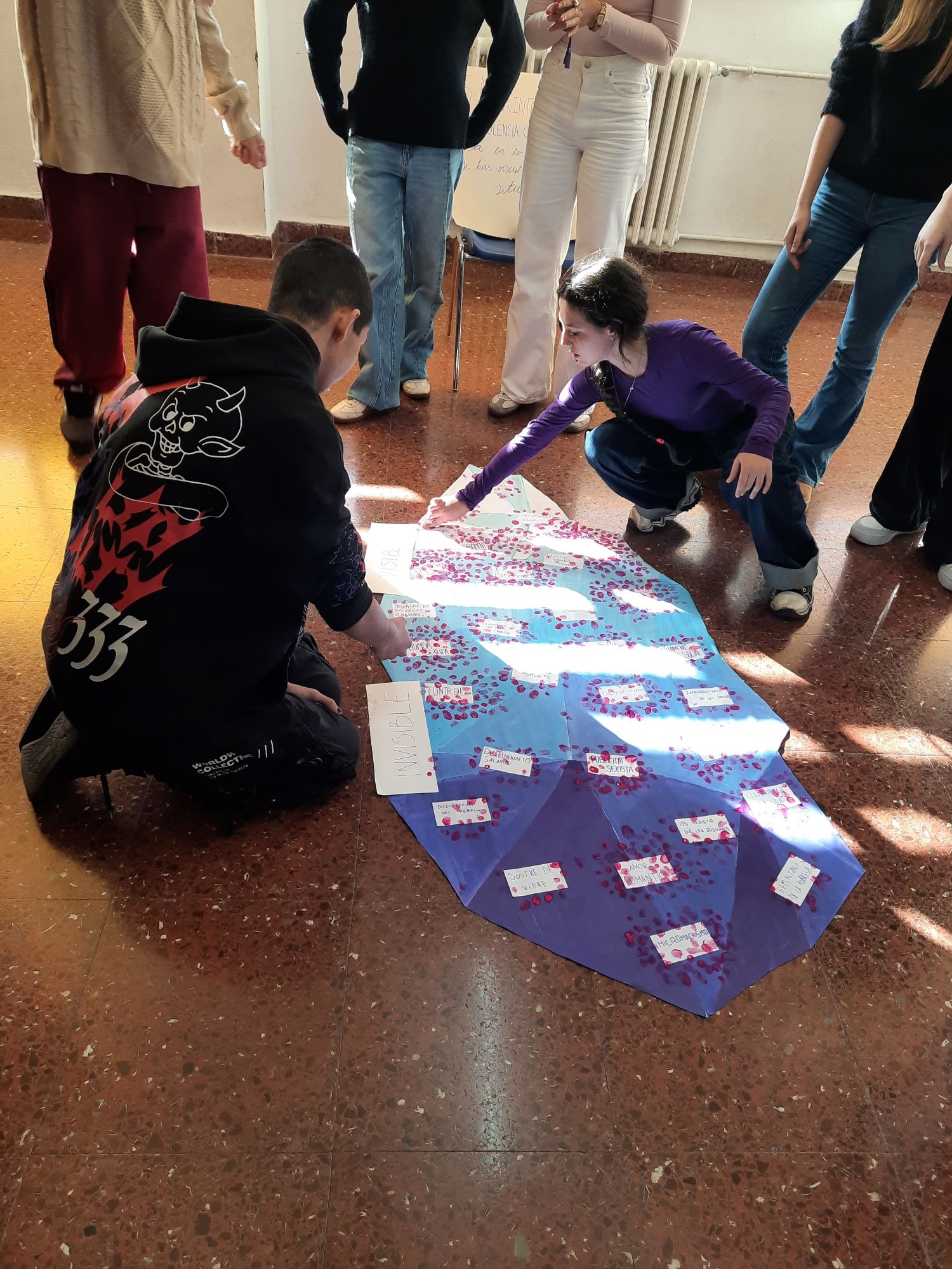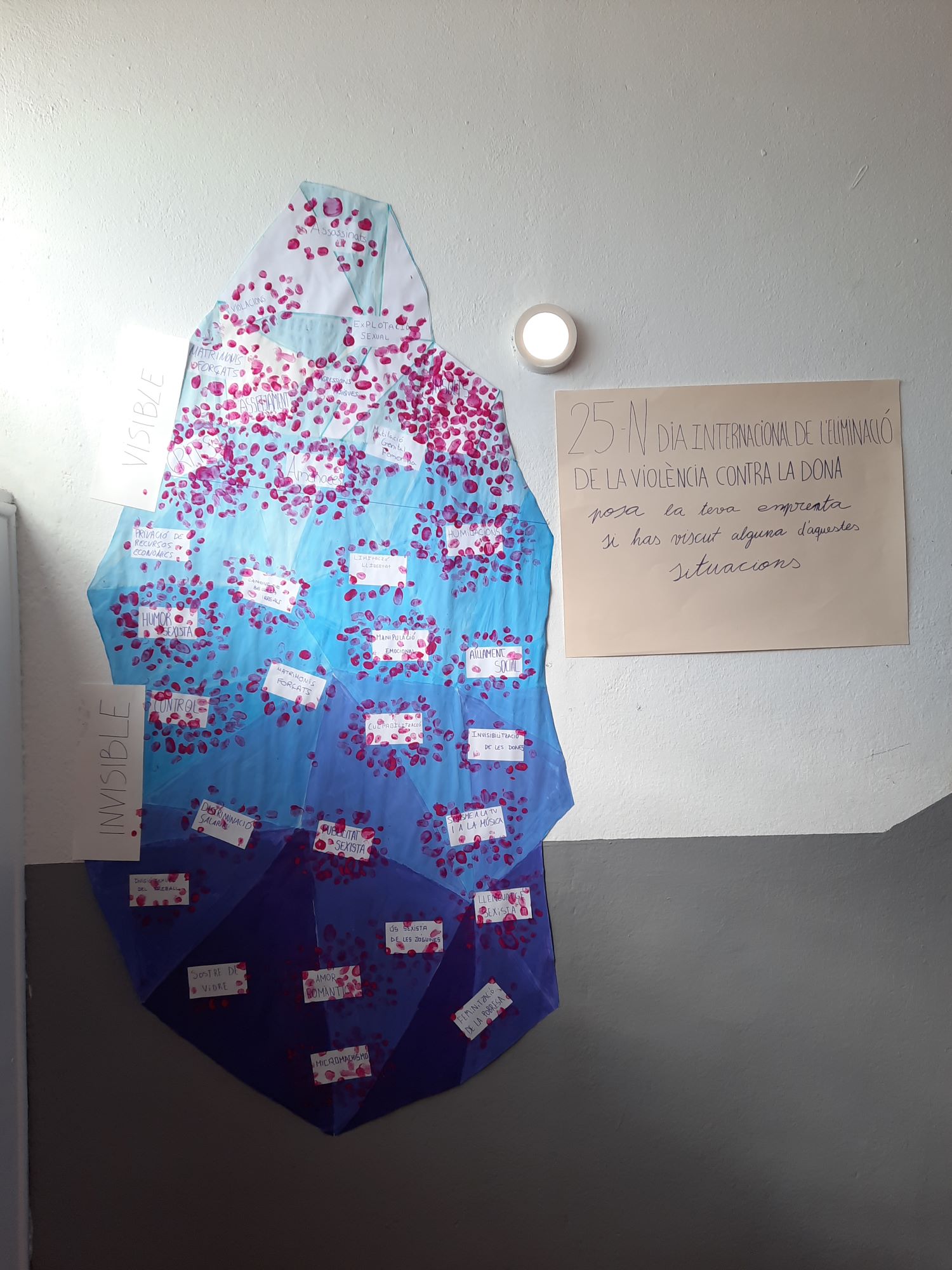 Després de veure les pel·lícules, tots els grups van participar en una activitat que tenia per objectiu reconèixer diferents tipus de violències de gènere, tant visibles com invisibles: sobre un iceberg dibuixat per l’alumnat de 2n de Batxillerat artístic, van marcar amb pintura les formes de violència masclista que malauradament continuem patint directament o trobant al nostre entorn més proper. Amb aquesta activitat es fa èmfasi en el fet que moltes d’aquestes agressions sovint passen per ser situacions normalitzades i es converteixen, per tant, en violències invisibles.
