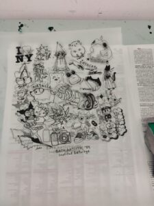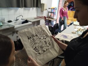 Els alumnes van seguir les indicacions d’en Josep de fer dibuixos per a muntar una composició conjunta a manera d’orla, per a estampar unes Tote Bags de record del seu pas pel batxillerat artístic del nostre centre Bellvitge.