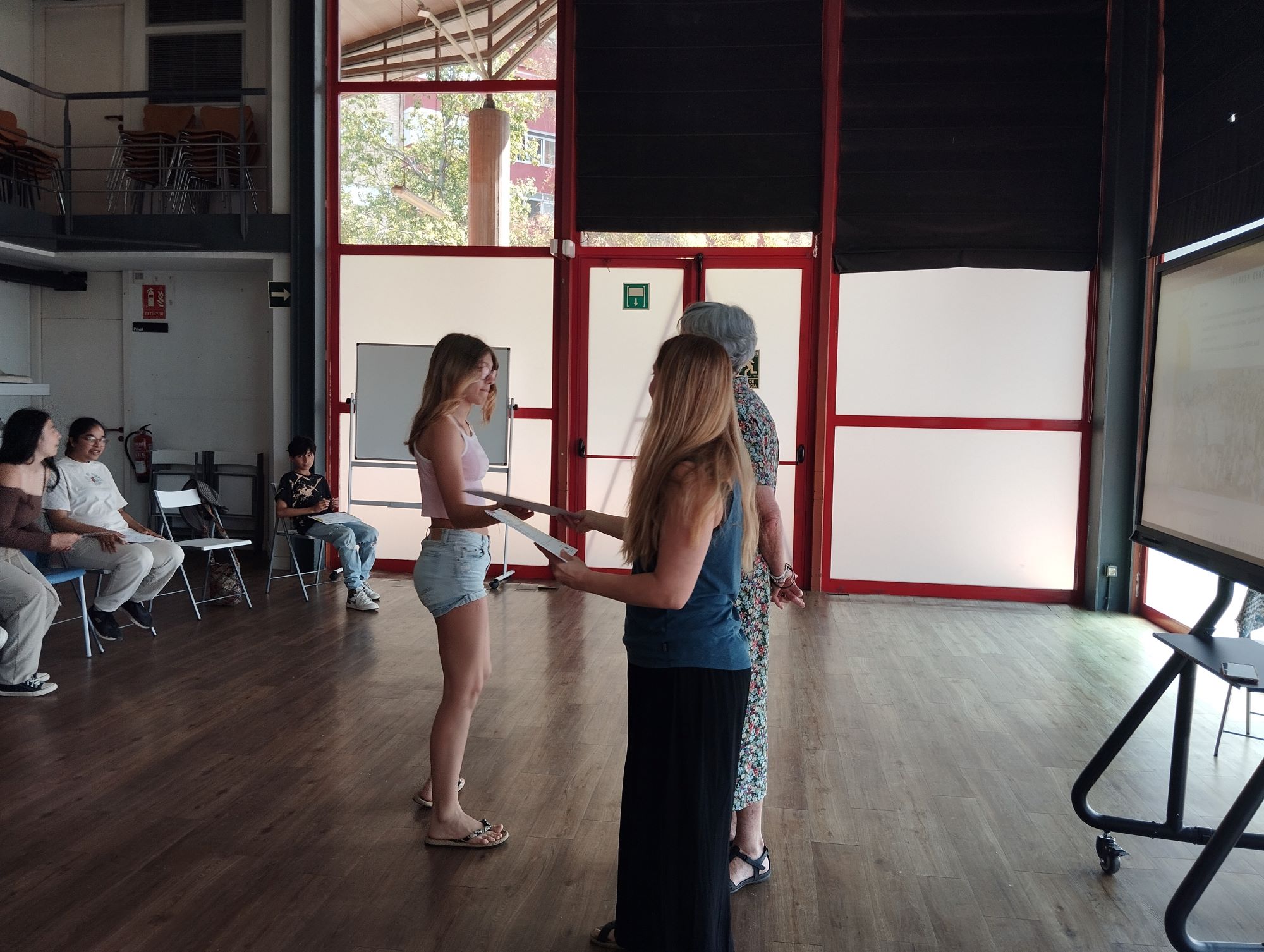 Hem fet un recull de tota la feina feta durant el curs, hem escoltat les paraules de reconeixement de la directora del centre i de la representant de la institució, encoratjant-nos a continuar treballant per a l’erradicació de tot tipus de violències. A continuació, la Cris, la nostra referent, ha fet lliurament dels diplomes de participació entre el nostre alumnat, i ens ha regalat un conte que va escriure ella mateixa.