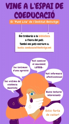En el marc de les activitats prèvies al 8M, durant aquest mes de febrer, estem presentant al nostre alumnat el nou espai coeducatiu de l’institut on hi trobaran informació, recursos, documents i lectures sobre coeducació i educació afectivo-sexual.