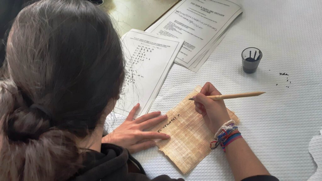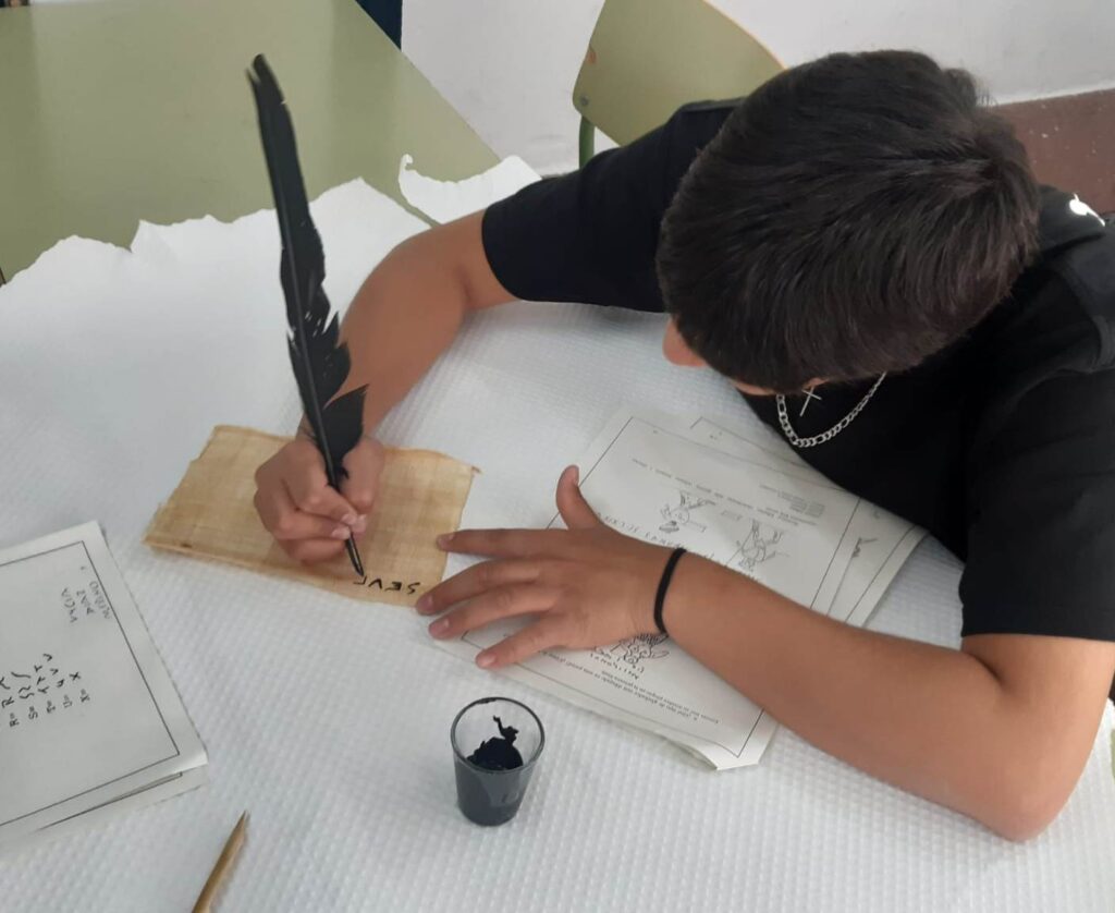 L’alumnat de Llatí de 4t ESO ha practicat avui, en el marc del projecte cooperatiu Arrels antigues de problemes actuals, l’escriptura antiga amb ploma i càlam sobre papir d’Egipte i amb punxó sobre taules encerades.