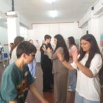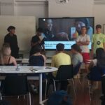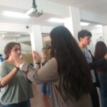 Aquest és el segon cop que acollim alumnes estrangers aquest curs, i com ja és habitual, el primer dia al matí, van començar fent un “tour” per l’institut i uns jocs per trencar el gel. A la tarda, ja van començar a treballar sobre el projecte. Durant tota la setmana, han estat treballant a la biblioteca i a la sala d’actes en petits grups per poder dur a terme la presentació final el divendres. Com si fossin professors i professores, els i les alumnes van dissenyar un mini-cicle d’activitats sobre les cançons. Han fet exercicis de “fill in the gaps”, Kahoots amb preguntes de comprensió, etc.