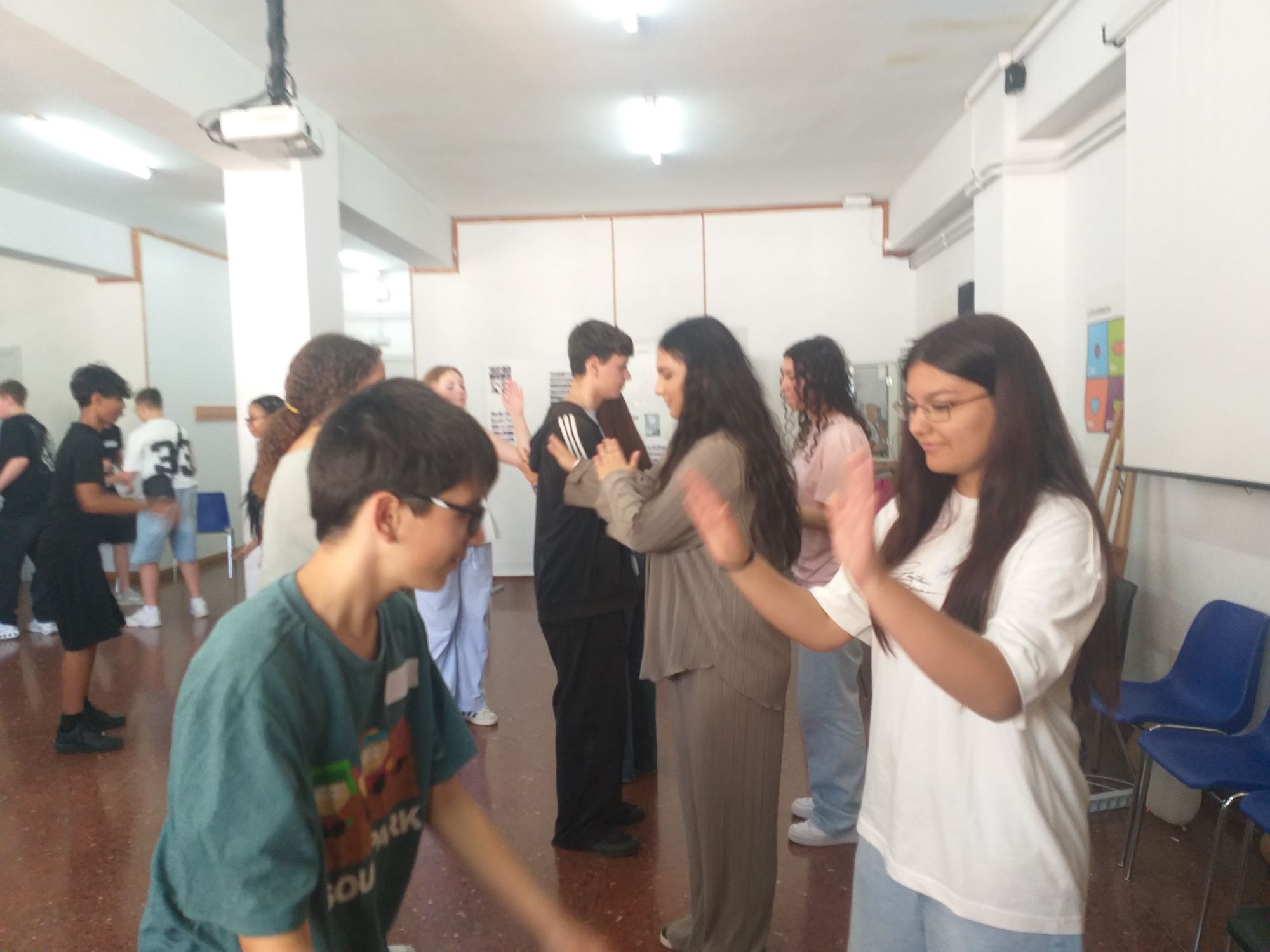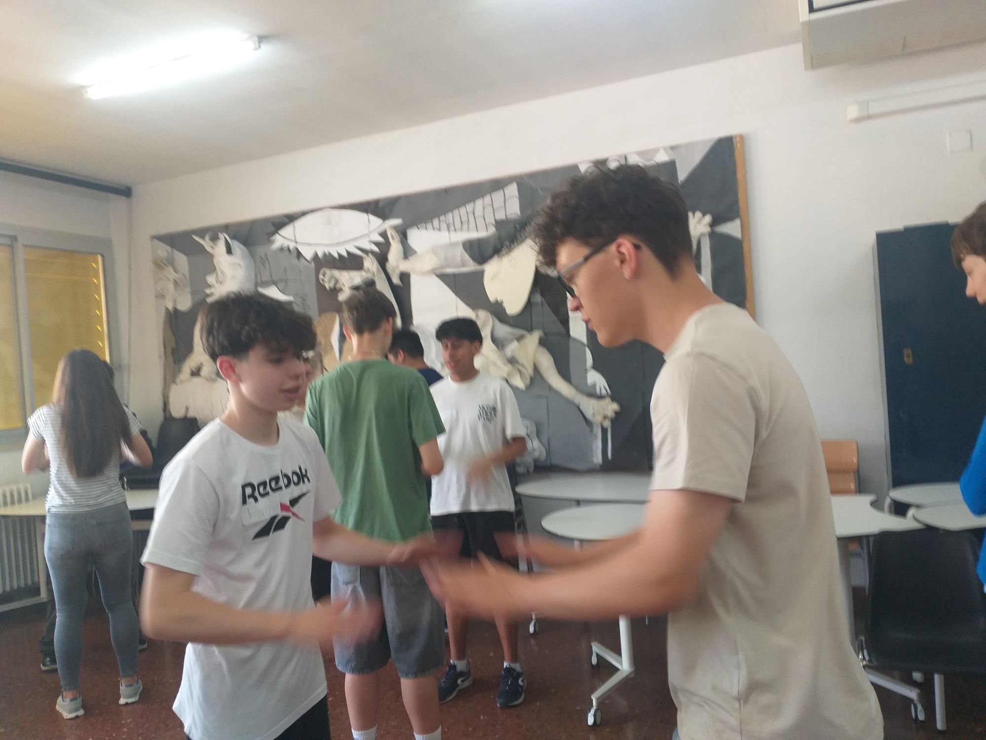 Aquest és el segon cop que acollim alumnes estrangers aquest curs, i com ja és habitual, el primer dia al matí, van començar fent un “tour” per l’institut i uns jocs per trencar el gel. A la tarda, ja van començar a treballar sobre el projecte. Durant tota la setmana, han estat treballant a la biblioteca i a la sala d’actes en petits grups per poder dur a terme la presentació final el divendres. Com si fossin professors i professores, els i les alumnes van dissenyar un mini-cicle d’activitats sobre les cançons. Han fet exercicis de “fill in the gaps”, Kahoots amb preguntes de comprensió, etc.