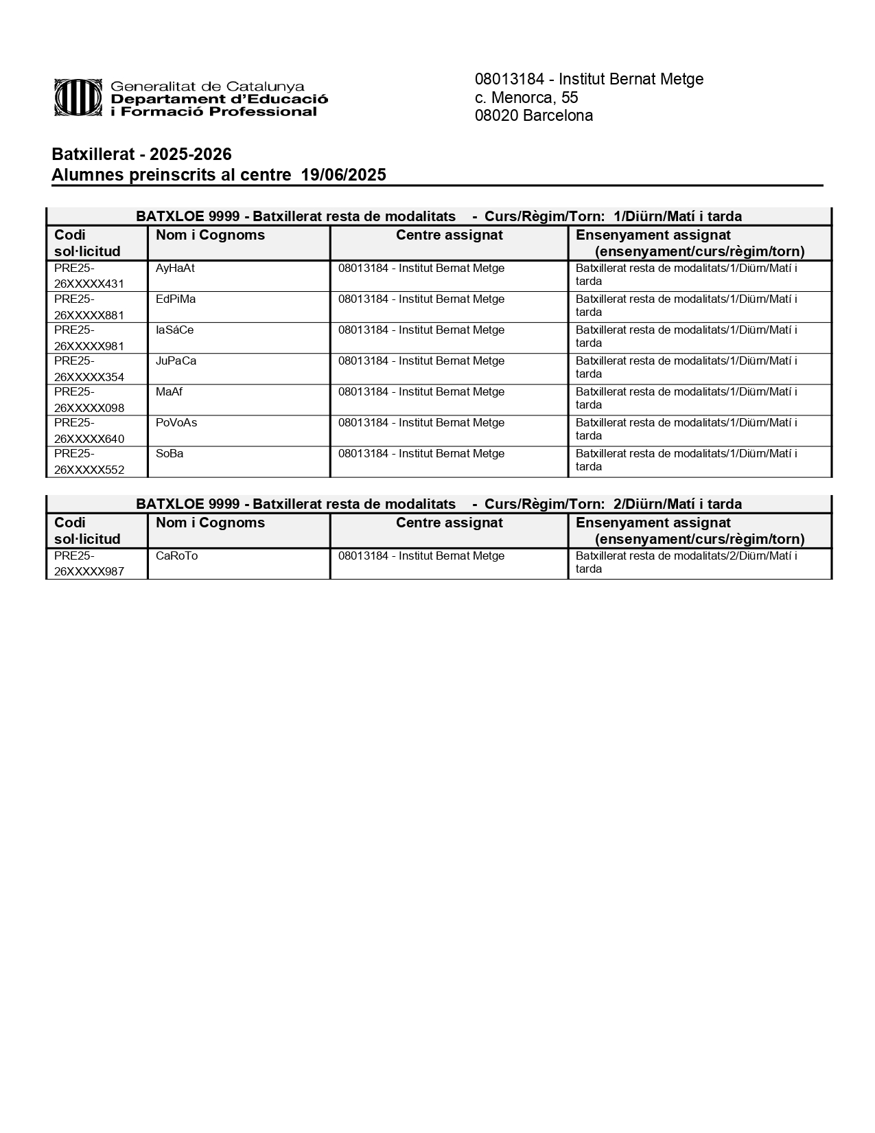 Assignacions d’alumnat BATXILLERAT PREINSCRITS a l’INSTITUT BERNAT METGE curs 2025/2026 admin23/06/25 Si ets una família que vas inscriure com a primera opció l’INSTITUT BERNAT METGE, aquest és el teu document. ATENCIÓ: El document ens informa del centre on hem estat assignats. Pot ser aquí a l’INSTITUT BERNAT METGE o un ALTRE centre.